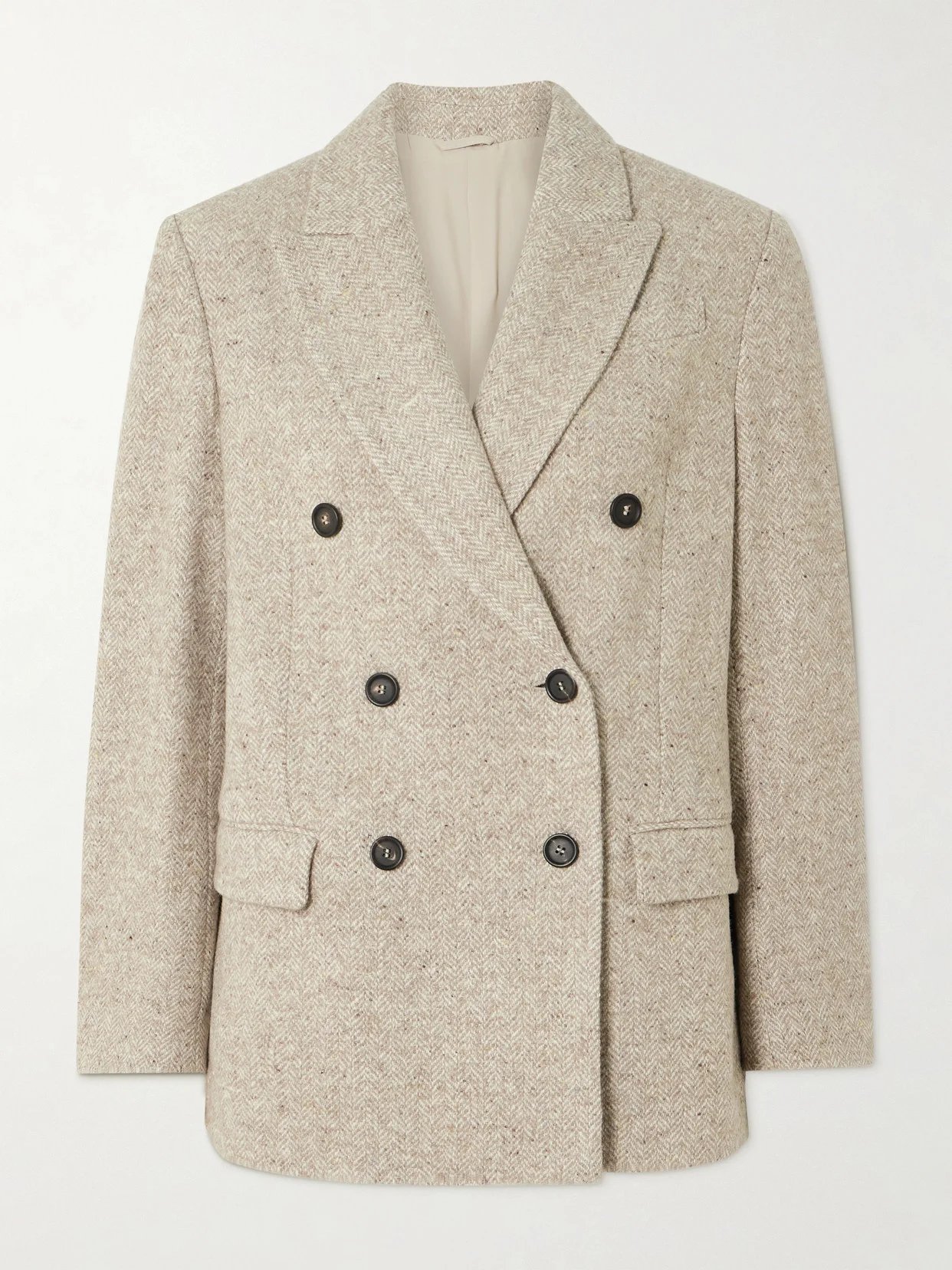 Brunello Cucinelli's blazer has been tailored in Italy from a luxurious blend of wool and silk-blend tweed. It has a smart double-breasted front, peak lapels and flap pockets. Wear it with the matching skirt.