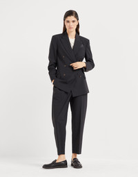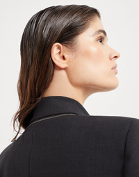 Refined materials enhance this Tropical Luxury wool blazer. The high-quality fabric complements the tailored-inspired garment, characterized by slightly oversized shoulders and a regular waist that highlight the silhouette. The embroidered monili detail behind the neck completes the blazer with an elegant, feminine sparkle. MATERIALS The lightweight fabric combines the virgin wool natural fiber with a percentage of synthetic to provide added comfort. DETAILS Horn button closure Silk-blend crepe lining Peak lapel Chest pocket Hand pockets with flap Cuffs have four horn buttons Single back vent Nickel-free monili decoration 75% VIRGIN WOOL, 23% NYLON, 2% ELASTANE