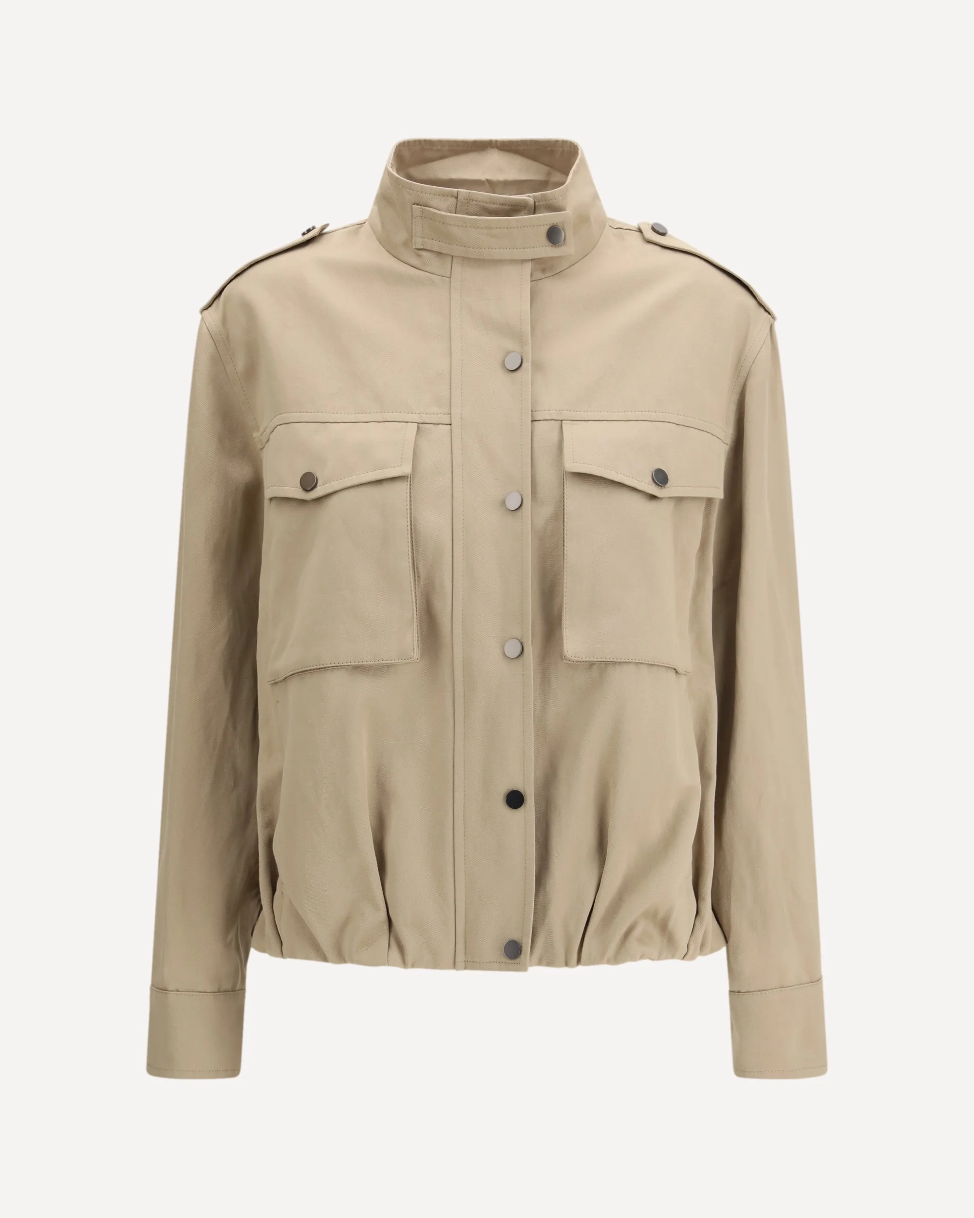 The Jacket by Brunello Cucinelli blends functional detailing with the brand’s understated sophistication. Its double closure with zip and snap buttons ensures practical versatility, while the stand collar with snap fastening adds a clean, structured finish. Patch pockets with flaps lend an authentic utility touch, complemented by snap-adjustable cuffs. The unlined construction keeps the design lightweight, and the elasticated hem shapes a comfortable, modern silhouette. DETAILS - Sku: ML5977782_C631 - Season: SS26 - Fit: Regular - Composition: OUTER 69% Cotton 31% Linen INNER 74% Acetate 26% Silk - MADE IN ITALY