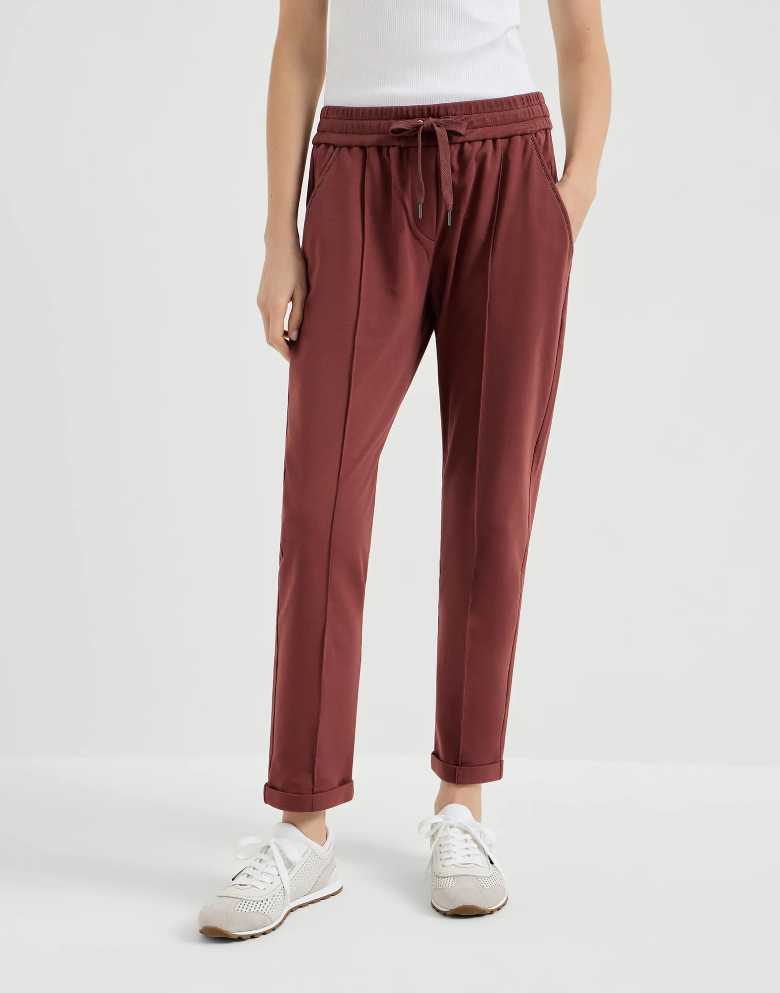 Refined Brunello Cucinelli materials are paired with the casual style of the Travelwear line, dedicated to moments of relaxation and leisure. These stretch cotton lightweight French terry trousers feature a comfortable cut in the seat that becomes fitted down the leg and slightly cropped at the bottom. The pull-on fit provides added comfort, while the use of shiny monili lends a delicate sparkling note. MATERIALS The stretch characteristic of the lightweight cotton French terry makes the garment comfortable to wear. DETAILS Pull-up trousers with drawstring Front pockets Nickel-free monili decoration 98% COTTON, 2% ELASTANE