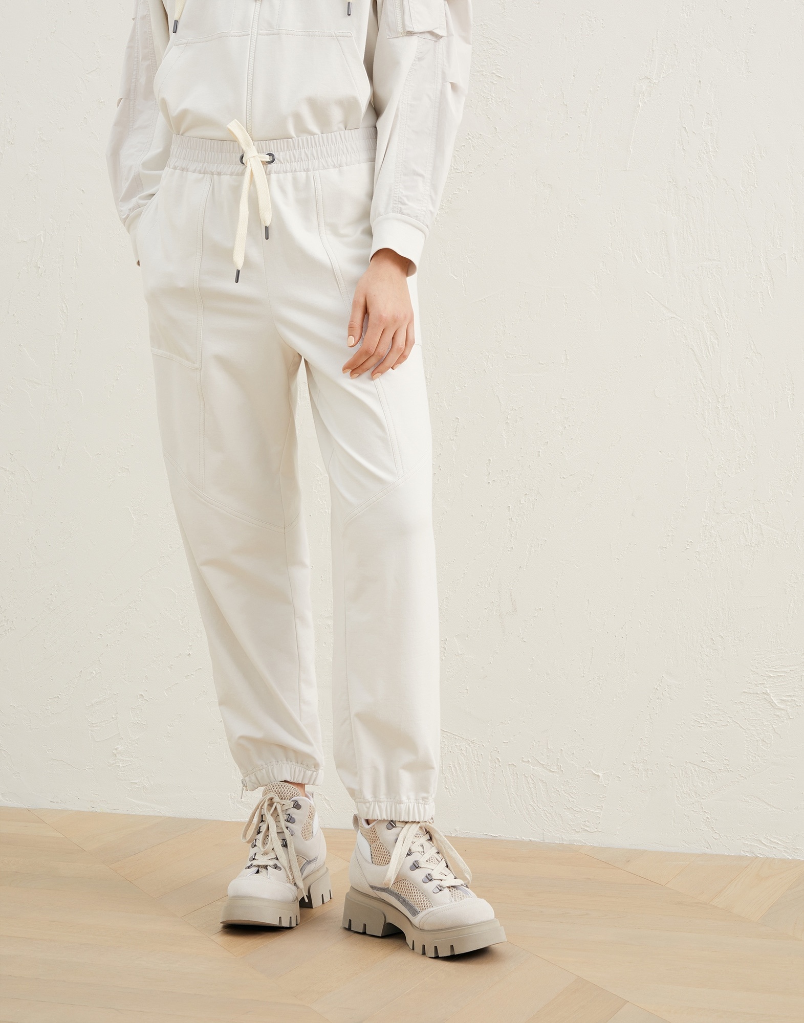 Refined Brunello Cucinelli materials are paired with the casual style of the Travelwear line, dedicated to moments of relaxation and free time. These lightweight and ultra soft stretch cotton French terry trousers are characterized by a drawstring pull-on fit, which is particularly comfortable both in the seat and along the leg. The versatility of the ankle zippers completes the garment with a functional design detail. MATERIALS The stretch characteristic of the lightweight cotton French terry makes the garment comfortable to wear. DETAILS Designed in Solomeo and handcrafted in Italy 98% COTTON, 2% ELASTANE