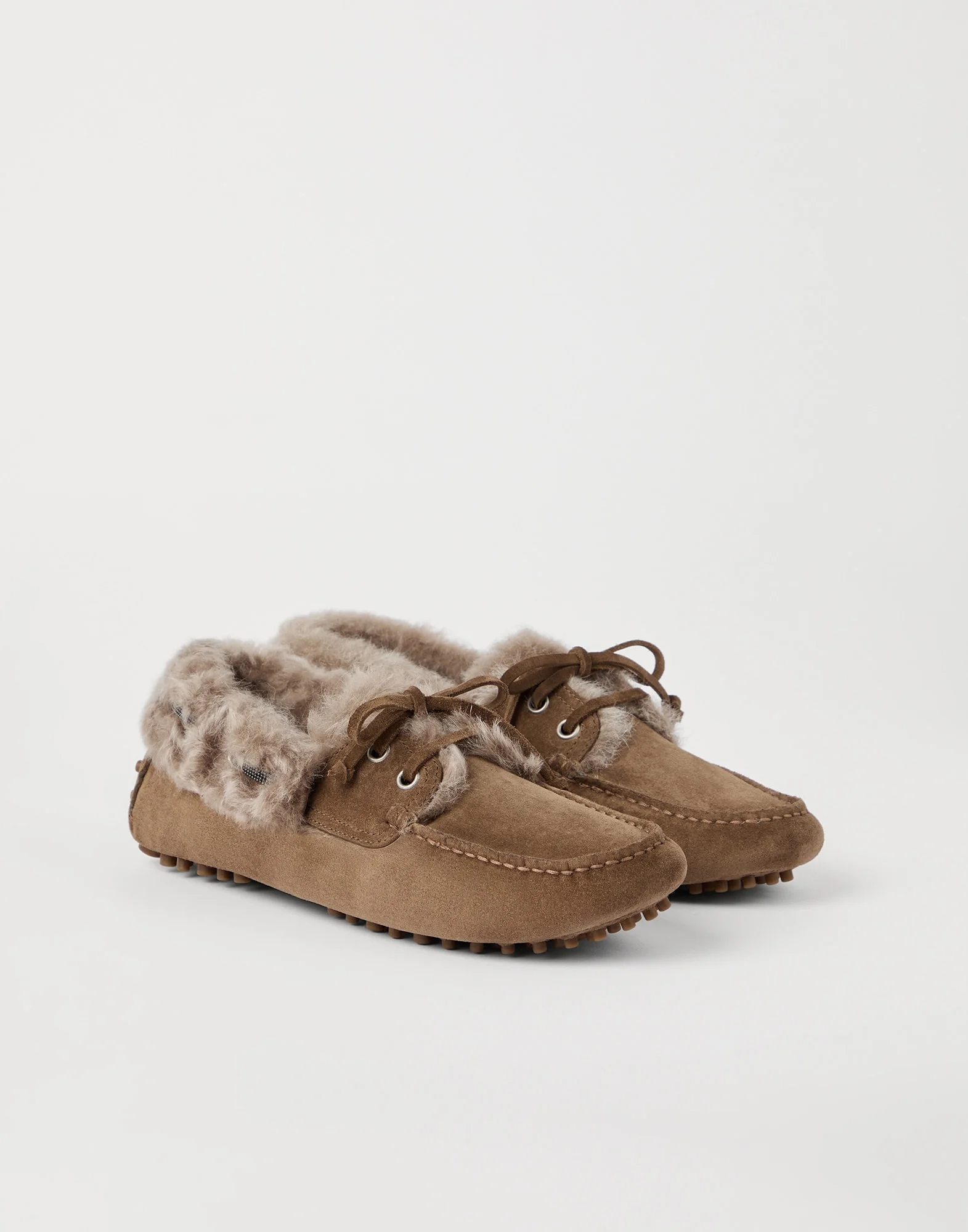 The timeless style of the Driving Loafers combines precious details with an extraordinarily flexible construction. This exquisitely “leisure” design stands out with a pleasant material contrast created by the combination of the velvety suede upper and the extremely warm and cozy soft shearling lining. The sole is covered in small rubber nubs ensuring maximum comfort, while shiny monili details, the iconic embellishment of the Brunello Cucinelli collections, complement the shoe with a delicate sparkling touch. MATERIALS Refined suede is a compact leather with a soft, velvety texture. The plush shearling lining and the ultra-lightweight rubber outsole provide the footwear with extraordinary comfort. DETAILS Shearling lining Rubber outsole Nickel-free monili decoration REAL LEATHER