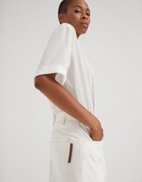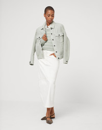 Casual inspiration characterizes this dyed comfort Soft denim skirt. The distinct five-pocket design is updated in a midi length with slightly curved lines. The contrast stitching stands out against the season's color and creates an elegant texture contrast. MATERIALS Garment-dye finishing gives the color a slight uneven aspect and creates mild shading along the seams and edges of the garment. The presence of a small percentage of spandex helps to make the fabric comfortable to wear. DETAILS Zip closure with button, metal hooks and backing button Front pockets Back patch pockets 99% COTTON, 1% ELASTANE