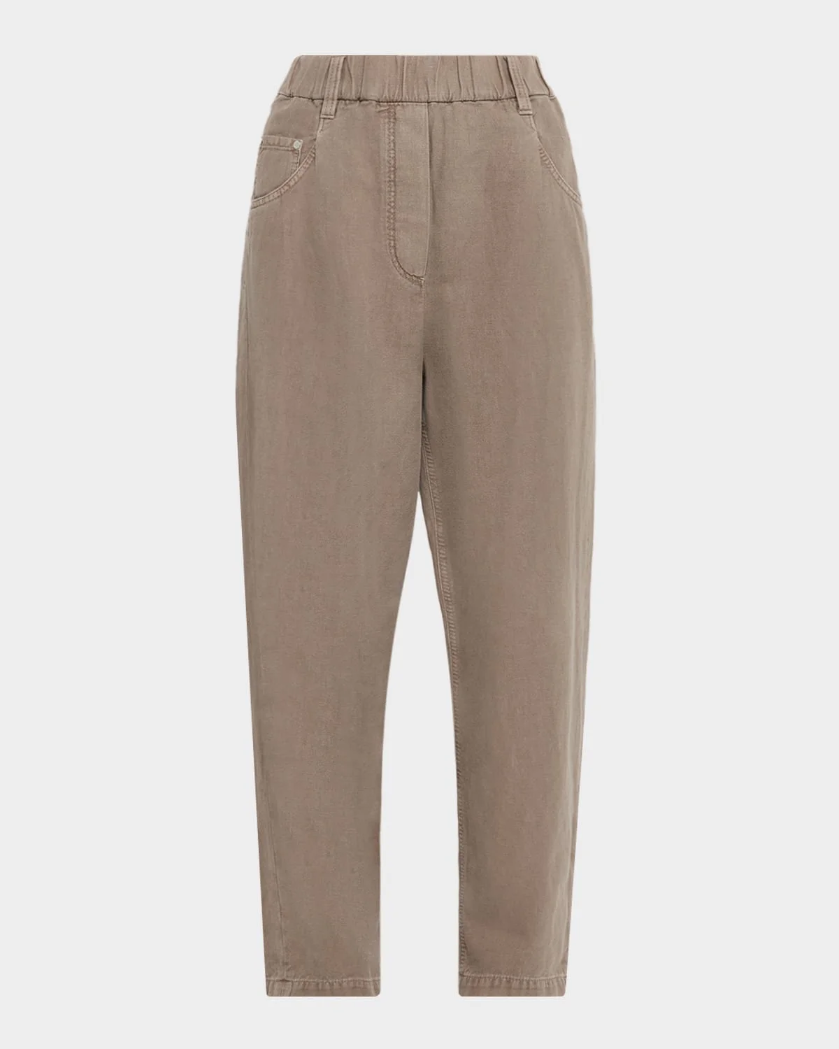 Crafted from dyed cotton twill, these pants from Brunello Cucinelli feature an elasticized waistband with a signature monili belt loop on the back and a single pleated front Mid rise sits high on hip Five-pocket style Pleated front Striaght legs Ankle length Pull-on style Cotton Dry clean Made in Italy "SIZE & FITModel measurements: 5 & apos;10"" tallModel is wearing a US size 4/Small"