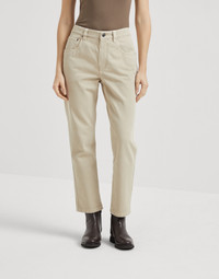 A casual attitude and precious details define the style of these five-pocket Straight trousers. The fit features regular proportions and a cropped feminine silhouette that is slightly fitted. The small tag on the back is entirely embroidered in fine rows of monili, the iconic embellishment of the Brunello Cucinelli collections. MATERIALS The pure cotton denim is garment-dyed in the season’s delicate colors. DETAILS Zip closure with button Front pockets with watch pocket Back patch pockets Nickel-free monili decoration 100% COTTON