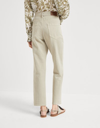 The silhouette of these Loose Retro trousers enriches the classic five-pocket style, a must-have womenswear piece. The pure cotton denim is a compact fabric, characterized by slight color fading that gives the garment a typically vintage allure. The fit offers relaxed proportions with a slight low-rise and a straight cut in the leg. MATERIALS The dyeing process carried out on the finished garment gives the pure cotton denim a delicate color with a slightly irregular appearance, creating light shading on the surface. DETAILS Zip closure with button Front pockets with watch pocket Back patch pockets 100% COTTON