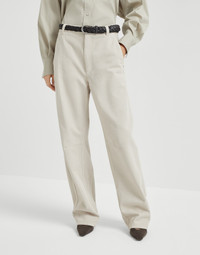 A relaxed silhouette meets elegant details to define the style of these new Curved Soft trousers in dyed denim. The garment features a generous, rounded shape that creates a slight curve down the leg and gives the design a sense of movement. An elegant shiny monili embroidery adds a sparkle in true Brunello Cucinelli style. MATERIALS The pure cotton denim is garment-dyed in the season’s delicate colors. DETAILS Zip closure with button and backing button Slanted front pockets Back patch pockets Nickel-free monili decoration 100% COTTON