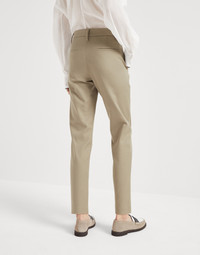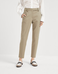 The excellence of Brunello Cucinelli materials elevates the essential, versatile style of these slim fit trousers. The cotton cover enriches the season’s colors with its characteristic diagonal twill and slightly raised texture, while the fabric’s stretch effect pairs perfectly with the slim fit, showcasing lines close to the leg. MATERIALS Cover is a twill fabric characterized by a slightly pronounced diagonal texture. The sporty feel of the fabric is balanced by the yarn dyeing, which disperses the colors of the season with an intense and sophisticated look. A very small percentage of spandex provides added comfort. DETAILS Zip closure with metal hook and backing button Front pockets Back welt pockets 97% COTTON, 3% ELASTANE