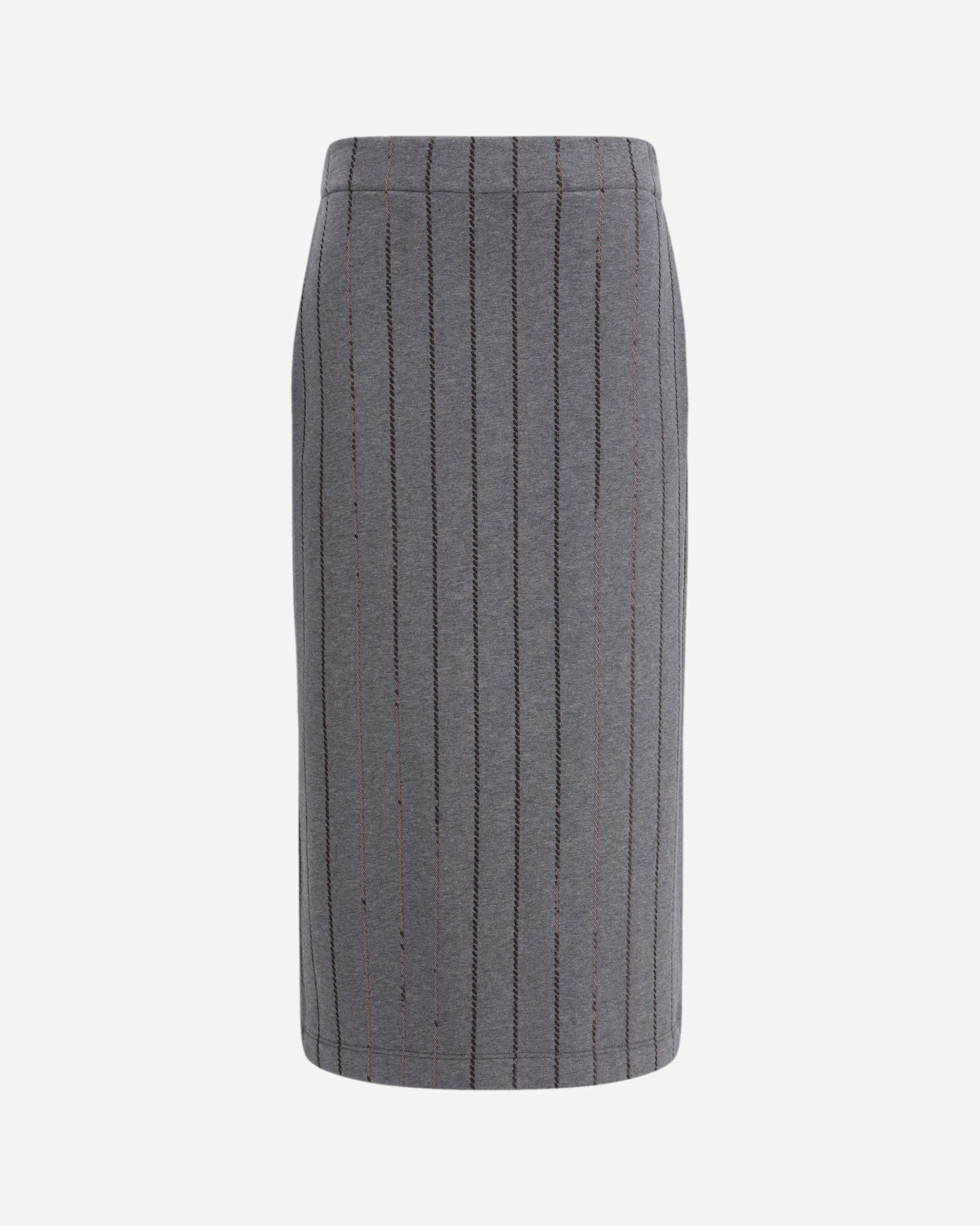 The Embellished Midi Pencil Skirt by Brunello Cucinelli features a fitted silhouette designed to follow the body with refined structure. The elasticated waistband offers comfort and a secure fit, while the rear slit ensures ease of movement without compromising the skirt’s clean line. The surface is enriched with signature embellishments applied with precise craftsmanship, adding subtle brightness and a polished finish. A versatile, understated piece that brings a touch of artisanal elegance to modern dressing. DETAILS - Sku: MP05NSO889_C8125 - Season: AW25 - Fit: Slim - Composition: GENERAL 100% Cotton - MADE IN ITALY