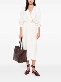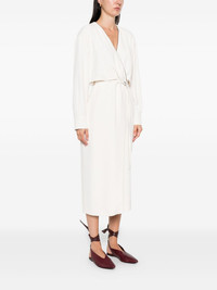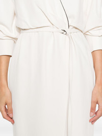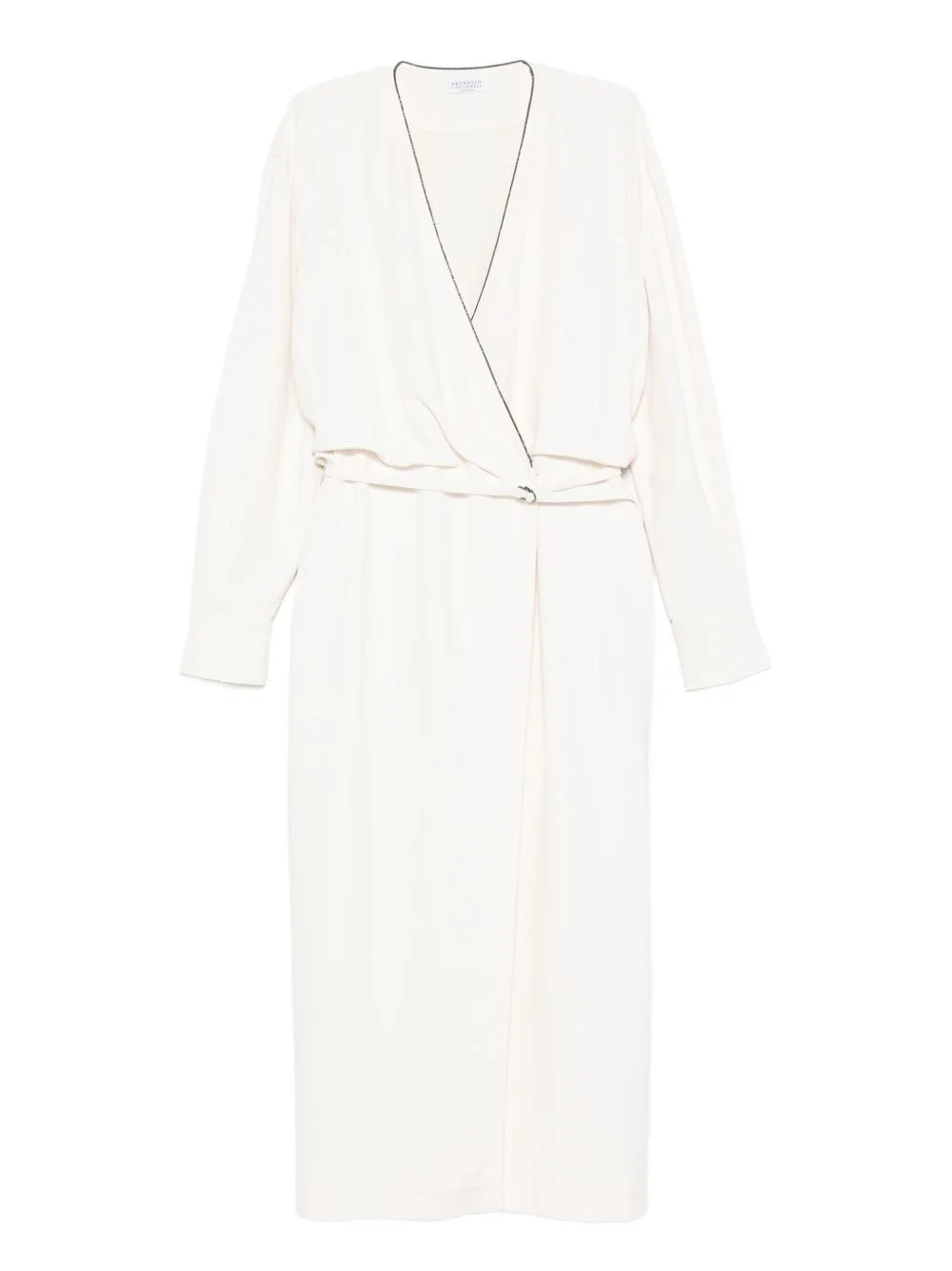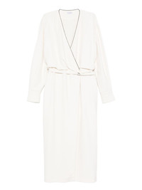 embellished wrap dress Highlights - White - Self-tie belt - Midi length - Metallic trim Made in Italy Composition Eco Brass 100%, Acetate 52%, Silk 48% SIZE & FIT Model measurements Height 5 ft 10 in(1.78 m) Bust/Chest 33.46 in(85 cm) Hips 36.22 in(92 cm) Waist 23.22 in(59 cm) Washing instructions Dry Clean Only
