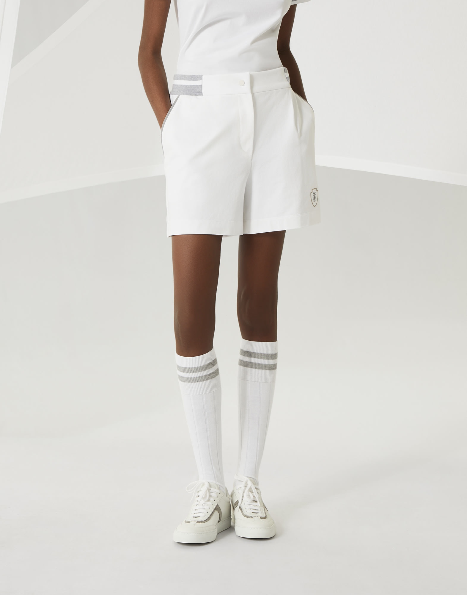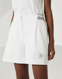 A sporty attitude and iconic elements define the style of the new Active shorts. The casual feel of these lightweight stretch cotton fleece shorts is enhanced by colored details on the practical drawstring closure and along the sides. The iconic Solomeo heraldic coat of arms complements the look of the garment. MATERIALS The stretch characteristic of the lightweight cotton French terry makes the garment comfortable to wear. DETAILS Zip closure with snap and backing button Front pockets Back pockets 98% COTTON, 2% ELASTANE