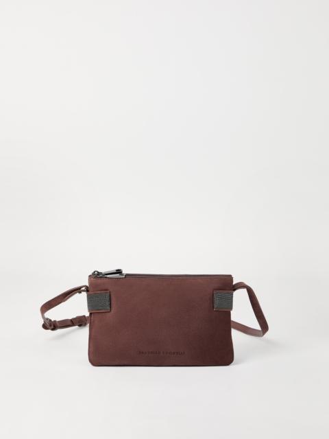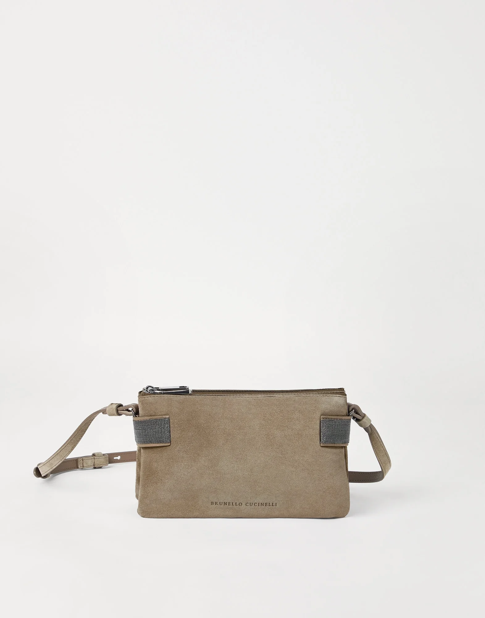 The soft touch and lightness of refined suede updates the classic square lines of this essence mini shoulder bag. The essential, geometric shape is illuminated with two inserts embroidered in precious monili that allow the width of the bag to be adjusted and hug the sides with a delicate sparkling effect. Offered in a small size for elegant versatility, it features an adjustable and removable shoulder strap that adds a functional element. MATERIALS The refined suede is a compact leather with a soft, velvety texture. A leather lining completes the look of the bag. DETAILS Double zip closure Adjustable and detachable shoulder strap Leather lining 1 slot for cards and business cards Nickel-free monili decoration Bag is 22 cm (8.66") long, 7 cm (2.76") wide, and 13.5 cm (5.31") high REAL LEATHER