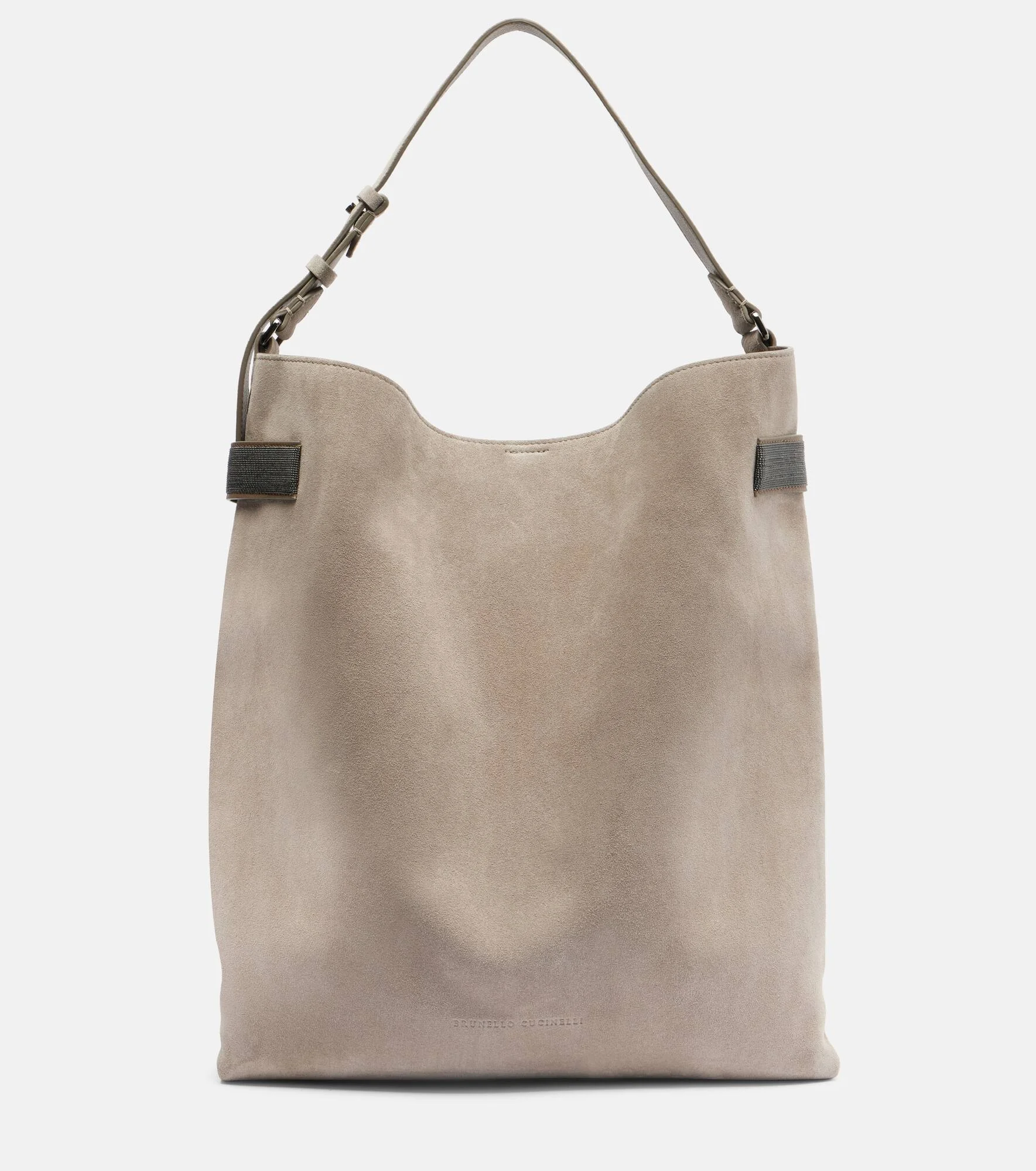 Brunello Cucinelli's designs are created in Solomeo, a medieval hamlet whose art and traditions are woven into the house's every fiber. Expertly crafted from suede, the Essence Large tote bag features an adjustable shoulder strap and signature Monili embellishments. Product Details - Material: calf leather (suede) - Lining: leather - Made in Italy - Color: grey - Designer color name: Ice - Item color: gray - Adjustable shoulder strap - Internal details: single compartment - Closure: magnetic fastening - Detachable zipped pouch - Includes: dust bag - Item number: P01131686 Size & Fit - Height 38cm-15" - Width 44cm-17.5" - Depth 14cm-5.5" - Adjustable shoulder strap - Min. length shoulder strap 40cm-15.5" - Max. length shoulder strap 56cm-22"