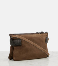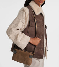 Brunello Cucinelli's designs are created in Solomeo, a medieval hamlet whose art and traditions are woven into the house's every fiber. Expertly crafted from suede, the Essence Small shoulder bag features two zipped compartments and signature Monili embellishments. Product Details - Material: leather (suede) - Lining: leather - Made in Italy - Designer color name: Torba - Item color: brown - Includes: dust bag - Adjustable shoulder strap - Item number: P01037907 Size & Fit - Height 13cm-5" - Width 21.5cm-8.5" - Depth 3cm-1" - Adjustable shoulder strap - Max. length shoulder strap 114cm-45"