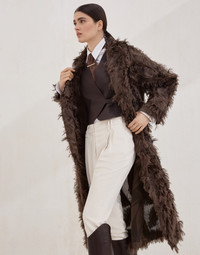 Refined workmanship and motifs inspired by the beauty of nature come together in this new Dracaena fil coupe belted coat in techno cotton and silk. The garment is made with the fil coupe technique to create a fringed, intentionally uneven design reminiscent of the delicate leaves of the Dracena plant. The practical self-tie belt gathers the garment’s volume and harmoniously highlights the waist, while the shiny monili embroidery on the cuffs adds a delicate sparkle in true Brunello Cucinelli style. MATERIALS The "fil coupe" technique involves the interweaving of threads which are then cut, leaving small fringes on the fabric’s surface, creating a particular three-dimensional effect. The natural cotton and silk fibers are combined with a synthetic fiber that ensures the style’s structure. DETAILS Horn button closure Half-lined in silk-blend crepe Lapel collar Hand pockets Button cuffs Detachable tie belt Single back vent Nickel-free monili decoration 67% POLYESTER, 22% COTTON, 11% SILK