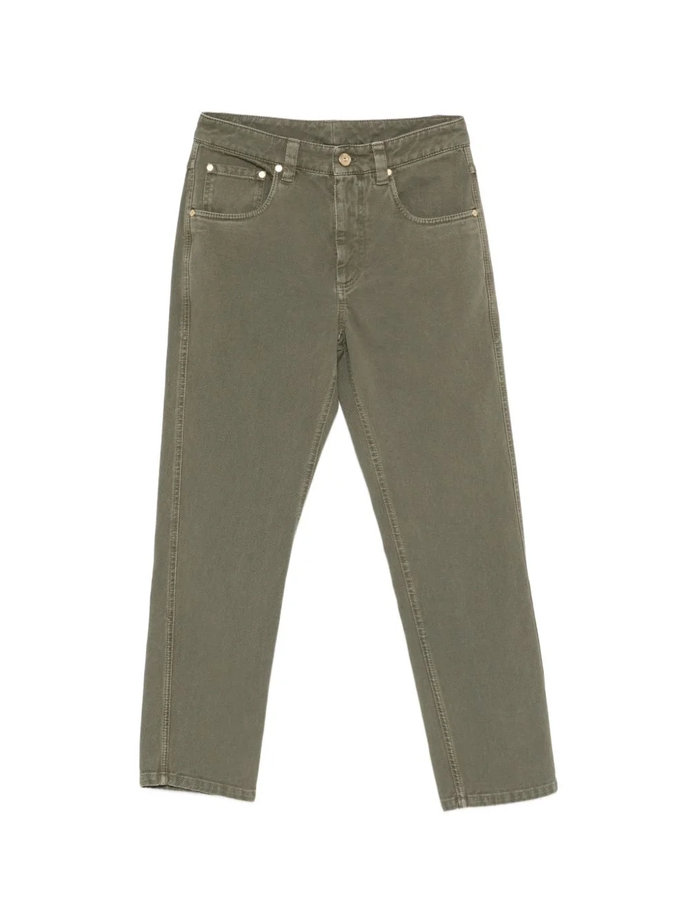 five-pockets jeans Highlights - Olive green - Topstitching - Belt loops - Button fastening - Five pockets Made in Italy Composition Outer: Cotton 100%, Calf Leather 100%, Eco Brass 100% Lining: Cotton 100% Washing instructions Machine Wash