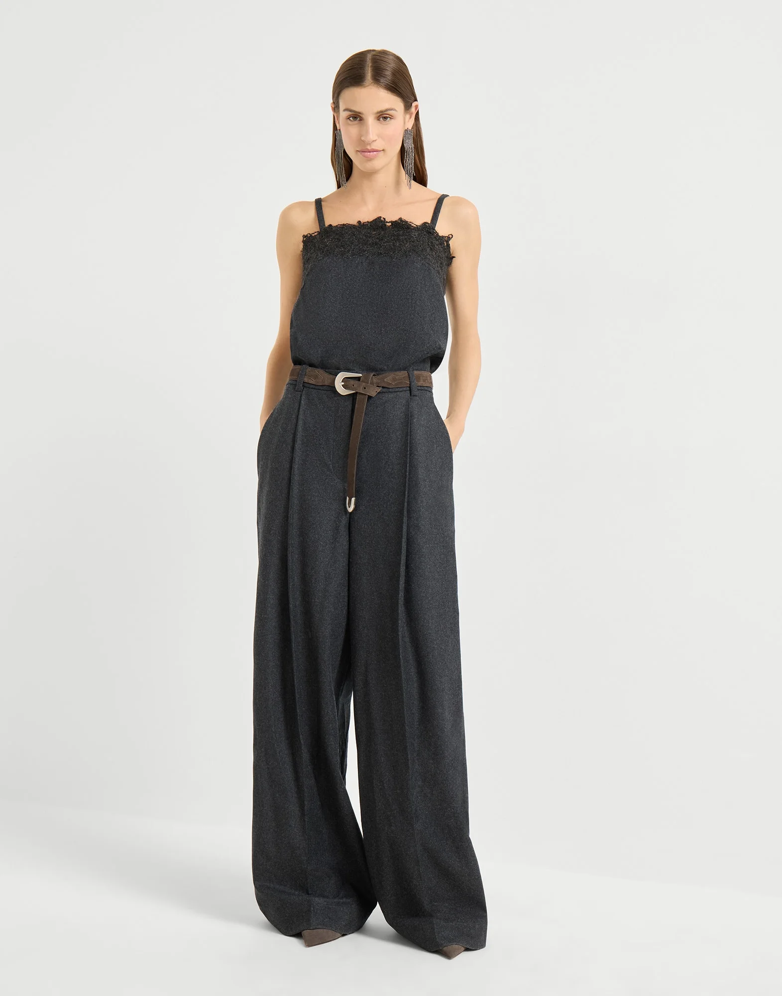 Virgin wool flannel jumpsuit with wispy lace embroidery