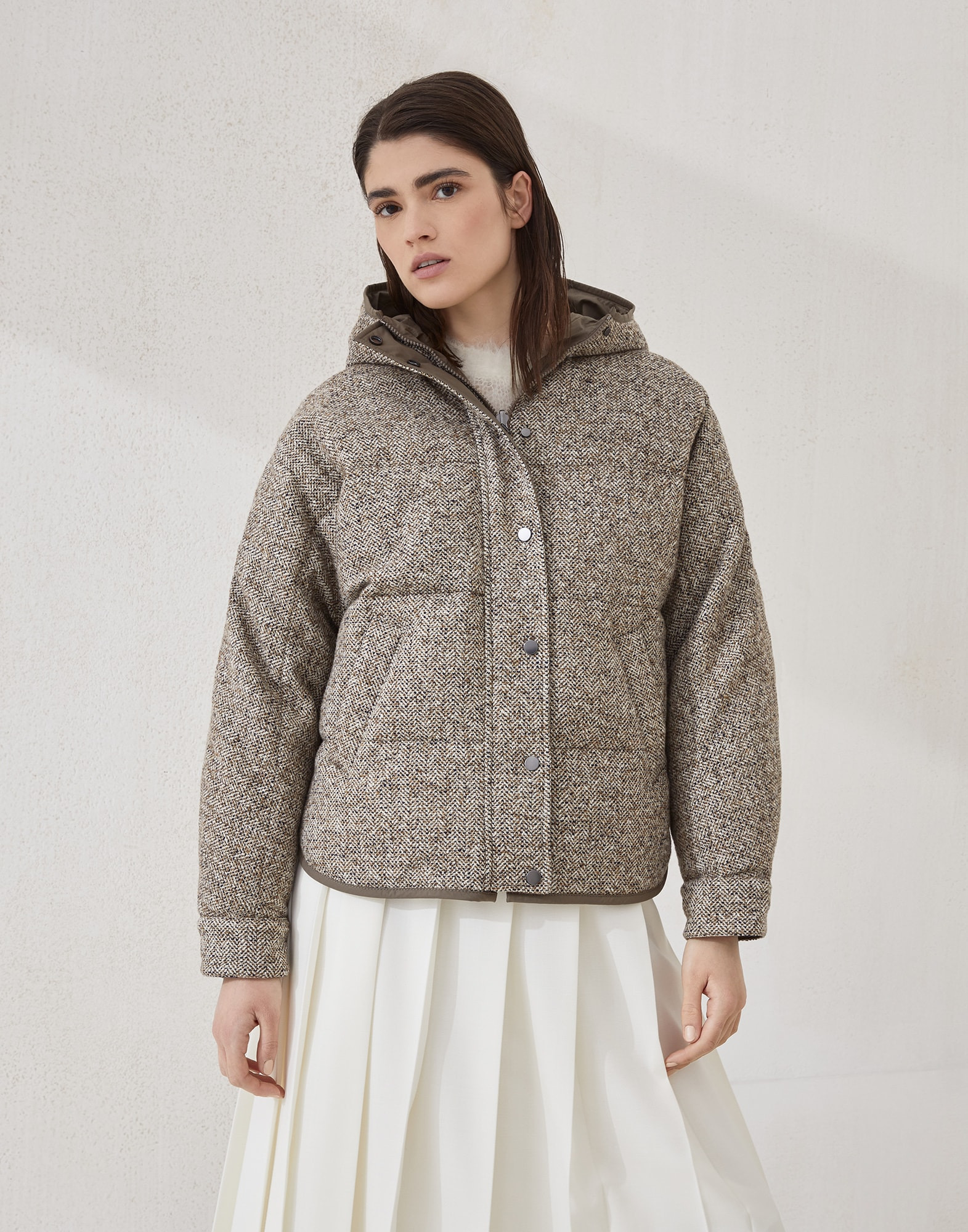 The allure of flecked chevron also spreads to the world of outerwear, thanks to this new down jacket made of refined virgin wool and silk. The fabric’s soft, compact texture is paired with goose down and feather padding, which accentuates the slightly generous silhouette and provides greater warmth. The hood introduces a functional detail, while the reversible side completes the garment’s versatile style. MATERIALS The flecked virgin wool and silk chevron stands out for its elegant herringbone design, enhanced by the refined irregularity of the flecked yarn. Soft and substantial, the hand reflects the warm texture of wool and the sophisticated sheen of silk. The plush padding is made from high-quality goose down and feather fill. All of the padding is sourced exclusively from European suppliers who are members of the EDFA (European Down and Feather Association), ensuring animal and environmental welfare. DETAILS Double closure with zip and snaps Water-resistant nylon lining Hood Hand pockets Snap cuffs Thermore® padding *Reversible side* Two interior pockets Hand pockets with zipper 73% VIRGIN WOOL, 22% SILK, 5% NYLON