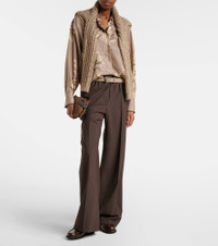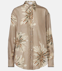 Brunello Cucinelli's designs are created in Solomeo, a medieval hamlet whose art and traditions are woven into the house's every fiber. Carefully crafted from silk, this shirt features a classic collar, rounded hemline, and sophisticated floral print. Product Details - Material: 100% silk - Care instructions: dry clean - Made in Italy - Color: green - Designer color name: Kaki - Details: 100% brass - Contains non-textile parts of animal origin - Collar: classic (Straight point) - Cuff: buttoned - Closure: buttoned front - Hem: rounded - Item number: P01143531 Size & Fit - True to size - Dropped shoulders - Designed for a loose fit - Non-stretchy fabric - Falls below the hip - The model seen in the picture is 178cm-5'10" and wearing a size XS