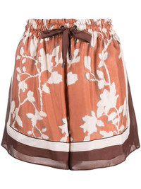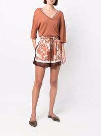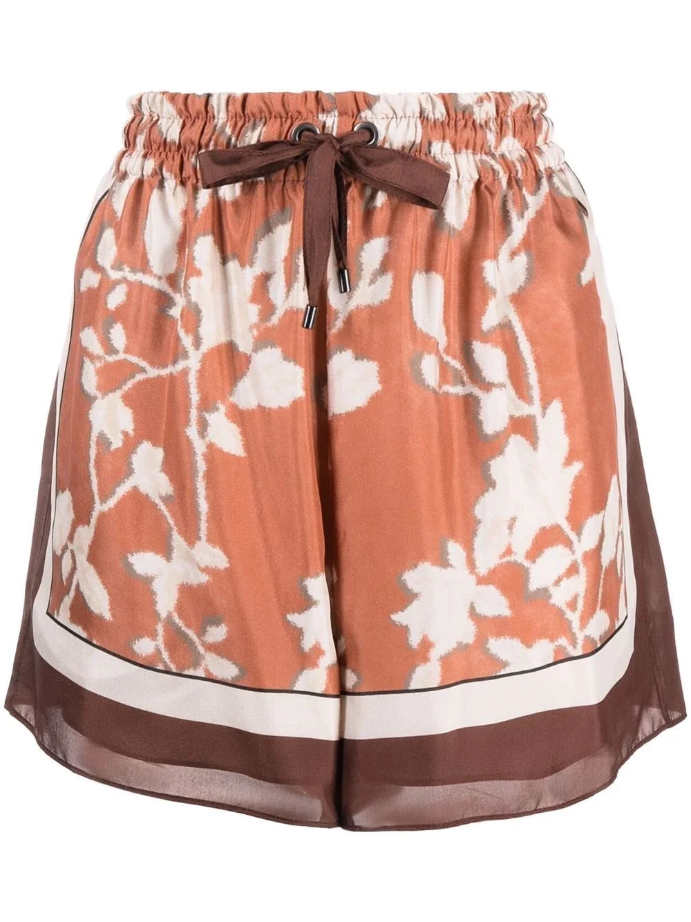 floral-print bermuda short orange/brown silk all-over floral print drawstring fastening waist high-waisted straight leg above-knee length Made in Italy Composition Outer: Silk 100%, Acetate 74% Lining: Silk 26% SIZE & FIT Model measurements Height 5 ft 10 in(1.78 m) Bust/Chest 33.46 in(85 cm) Hips 36.22 in(92 cm) Waist 23.22 in(59 cm) FittingInformation This piece fits true to size. We recommend you get your regular size Designed to be fitted at the waist, loose over the leg Made with a lightweight non-stretch fabric Washing instructions Dry Clean Only