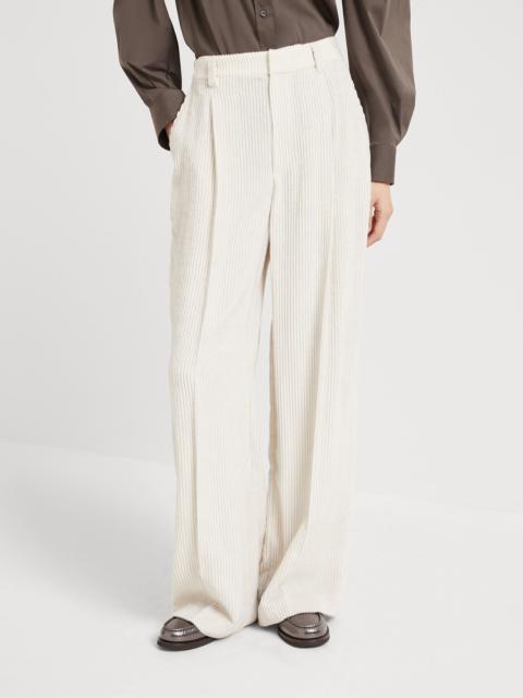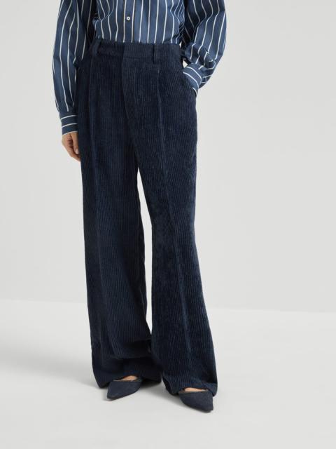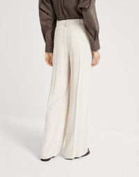 A casual attitude and the world of classics come together in these new Fluid corduroy Sartorial Track trousers. The pleats run lightly down the leg, harmoniously following the garment’s movement. The soft hand of the corduroy and viscose make the texture semi-glossy and fluid for a very comfortable fit. The iconic shiny monili embroidery completes the design with an elegant sparkle in true Brunello Cucinelli style. MATERIALS Corduroy, with a soft hand, is reinterpreted in a modern way thanks to the use of viscose, giving this garment a distinctly fluid, glossy and slightly textured touch. DETAILS Zip closure with metal hooks and backing button Slanted front pockets Pleat Back welt pockets Rear elastic band Unlined Nickel-free monili decoration 75% VISCOSE, 25% POLYESTER