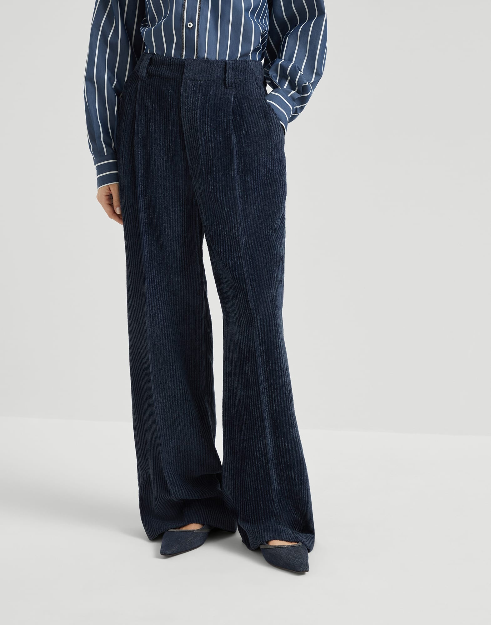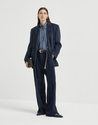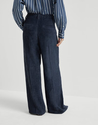 A casual attitude and the world of classics come together in these new Fluid corduroy Sartorial Track trousers. The pleats run lightly down the leg, harmoniously following the garment’s movement. The soft hand of the corduroy and viscose make the texture semi-glossy and fluid for a very comfortable fit. The iconic shiny monili embroidery completes the design with an elegant sparkle in true Brunello Cucinelli style. MATERIALS Corduroy, with a soft hand, is reinterpreted in a modern way thanks to the use of viscose, giving this garment a distinctly fluid, glossy and slightly textured touch. DETAILS Zip closure with metal hooks and backing button Slanted front pockets Pleat Back welt pockets Rear elastic band Unlined Nickel-free monili decoration 75% VISCOSE, 25% POLYESTER