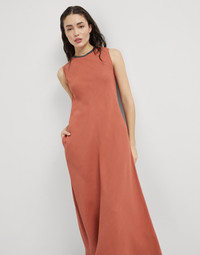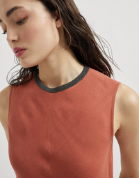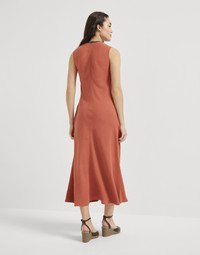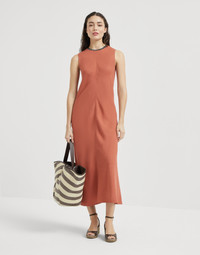 Fluid lines and feminine elegance define this viscose and linen fluid twill dress. The style features a fitted waist and then opens into a slight flare at the bottom, giving the harmonious silhouette a sense of movement and lightness. A refined shiny monili embroidery enriches the crew-neck with a delicate sparkle in true Brunello Cucinelli style. MATERIALS The combination of viscose and linen gives this twill a lightweight, flowing yet slightly crushed appearance. The characteristics of the fabric are further highlighted by the nuanced color variations. DETAILS Crew-neck Zip opening at back of neck Vertical front pockets Unlined Nickel-free monili decoration 72% VISCOSE, 28% LINEN