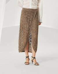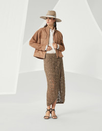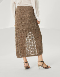 Essential lines and the refined craftsmanship of knitwear come together in this new Foliage Lace knit skirt. The straight silhouette is characterized by sophisticated knitting reminiscent of elegant lace with a delicate nature-inspired pattern. The garment’s openwork is enriched with small flashes of sequins set into the yarn, creating a feminine sparkling note. The pull-on design perfects the skirt’s comfort and casual style. MATERIALS The slubbed linen yarn gives the openwork a three-dimensional look, highlighted by the shiny sequins of the silk Diamond yarn. The organza slip provides added comfort, while its delicate transparency allows the Foliage pattern to be seen. DETAILS Pull-up skirt Half-lined in silk-blend crepe Net knitting 63% LINEN, 26% POLYESTER, 11% SILK