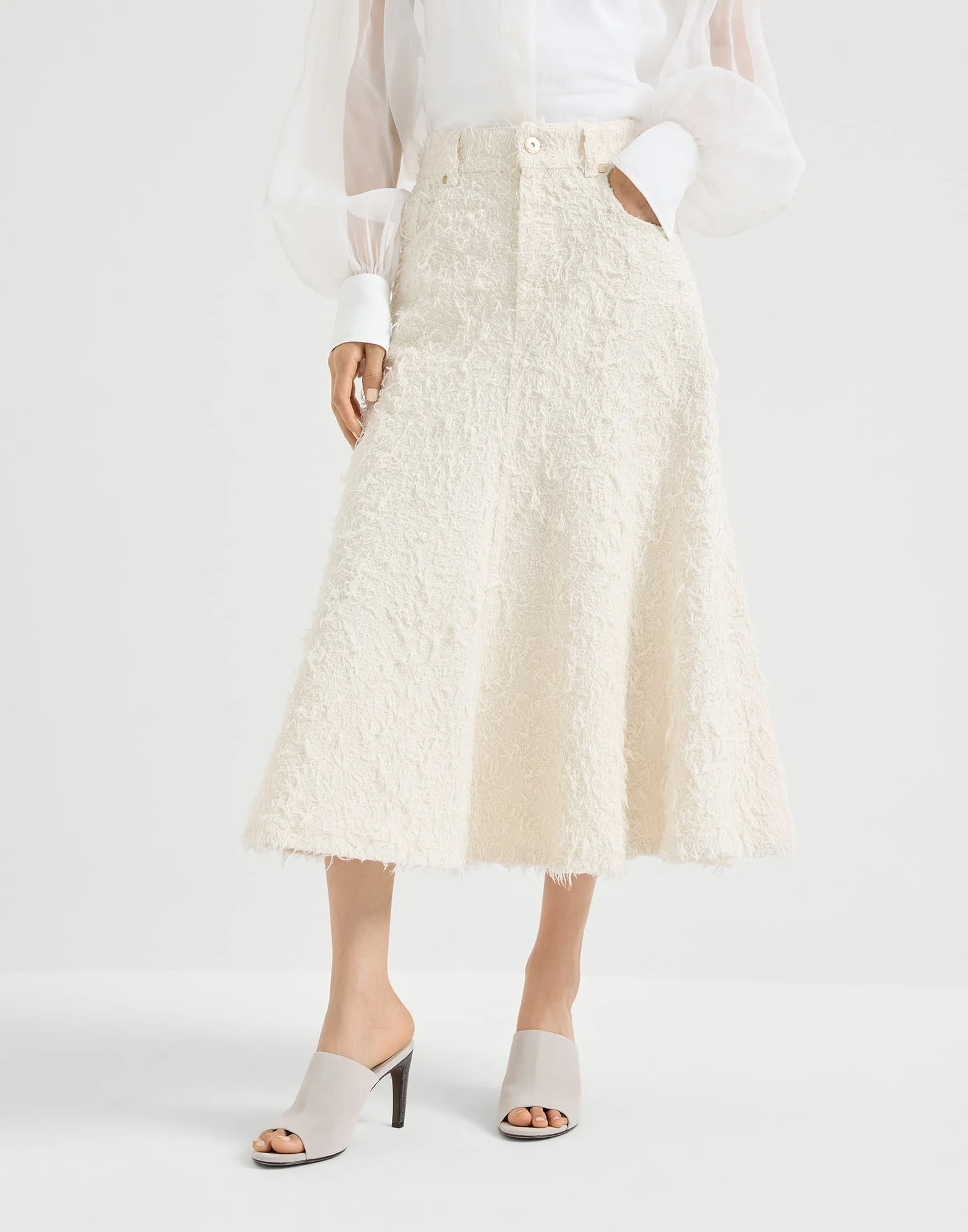 Feminine volume and refined materials come together in this fuzzy denim five-pocket flared skirt. The five-pocket silhouette’s casual, effortless feel is enriched by the special airy texture of the fuzzy denim with a wavy effect. The regular fit in the hips develops wide and flared, while a subtle shiny monili embroidery on the rear belt loop adds a delicate sparkling note in true Brunello Cucinelli style. MATERIALS Fuzzy dyed denim is a special fabric created using a needle-punching technique, which lifts the surface fibers of the material to create a soft, three-dimensional effect. DETAILS Zip closure with button Front pockets with watch pocket Back patch pockets Nickel-free monili decoration 100% COTTON