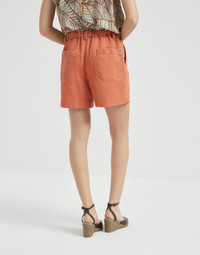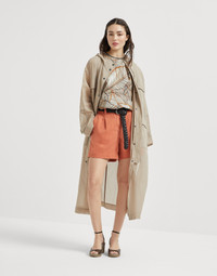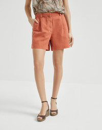 A distinctly summery feel characterizes these cotton and linen cover baggy shorts. The garment combines the sartorial inspiration of the pleats with the casual fabric, for a sophisticated mix of styles. The shiny monili detail completes the design with a note of feminine sparkle in true Brunello Cucinelli style. MATERIALS Cover is a fabric characterized by a slightly three-dimensional diagonal texture. The blend of cotton and linen lessens the twill pattern, giving the garment a soft, casual look. DETAILS Zip closure with metal hooks and backing button Slanted front pockets Back patch pockets Pleat Unlined Nickel-free monili decoration 60% COTTON, 40% LINEN