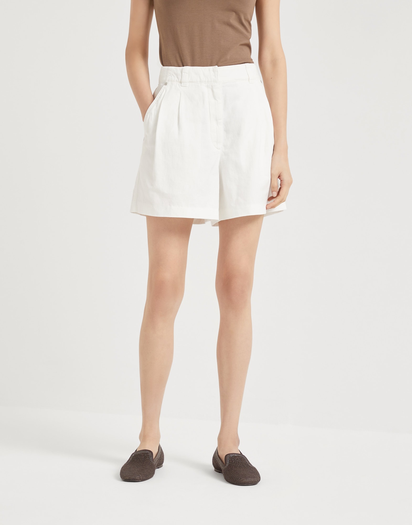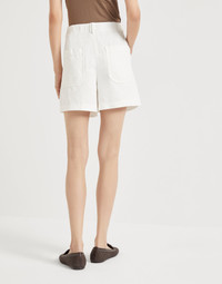 A distinctly summery feel characterizes these cotton and linen cover Baggy shorts. The garment pairs the sartorial inspirations of the double pleats with the casual flair of the fabric, for a sophisticated combination of styles. The shiny monili detail complements the piece with a feminine sparkling note, in true Brunello Cucinelli style. MATERIALS Cover is a fabric characterized by a slightly three-dimensional diagonal texture. The blend of cotton and linen lessens the twill pattern, giving the garment a soft, casual look. DETAILS Zip closure with metal hooks and backing button Front pockets Double pleat Back patch pockets Nickel-free monili decoration 60% COTTON, 40% LINEN