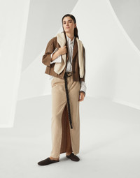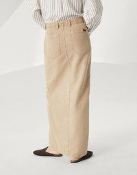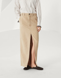 A mix of style defines the contemporary allure of this cotton and linen cover Chino skirt. The garment features pockets inspired by the world of denim and a straight silhouette with a deep center slit with a feminine feel. The use of monili on the back pocket gives the skirt a refined, feminine note in true Brunello Cucinelli style. MATERIALS Cover is a fabric characterized by a slightly three-dimensional diagonal texture. The blend of cotton and linen lessens the twill pattern, giving the garment a soft, casual look. DETAILS Zip closure with button Front pockets Vent at bottom Back patch pockets Nickel-free monili decoration 60% COTTON, 40% LINEN