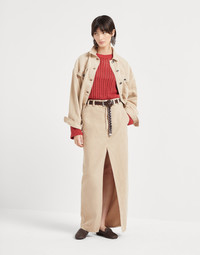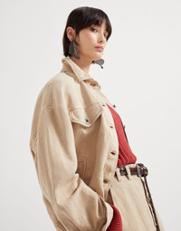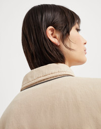 The refined materials of the Brunello Cucinelli collections update the sporty lines of this four-pocket jacket. The distinctive diagonal texture of the cotton and linen cover, dyed in the season’s delicate colors, is paired with the casual details of the flap pockets and the metal buttons closure. The precious monili behind the neck adds a refined, shiny and feminine note. MATERIALS Cover is a fabric characterized by a slightly three-dimensional diagonal texture. The blend of cotton and linen softens the twill pattern, giving the garment a soft, casual look. DETAILS Metal button closure Hand pockets Elasticized hem Button cuffs Unlined Two interior pockets Nickel-free monili decoration 60% COTTON, 40% LINEN