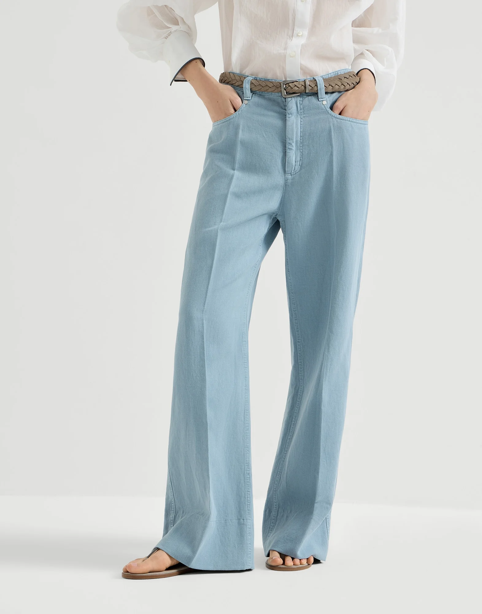 Refined cotton and linen cover defines the summery feel of these new Loose trousers. The garment stands out for its very contemporary silhouette, characterized by comfortable proportions with lines that develop straight and wide in the leg, highlighted by a tailored crease for a sophisticated mix of style. The use of precious monili completes the look with a feminine note in true Brunello Cucinelli style. MATERIALS Cover is a fabric characterized by a slightly three-dimensional diagonal texture. The blend of cotton and linen lessens the twill pattern, giving the garment a soft, casual look. DETAILS Zip closure with button Back patch pockets Nickel-free monili decoration 60% COTTON, 40% LINEN
