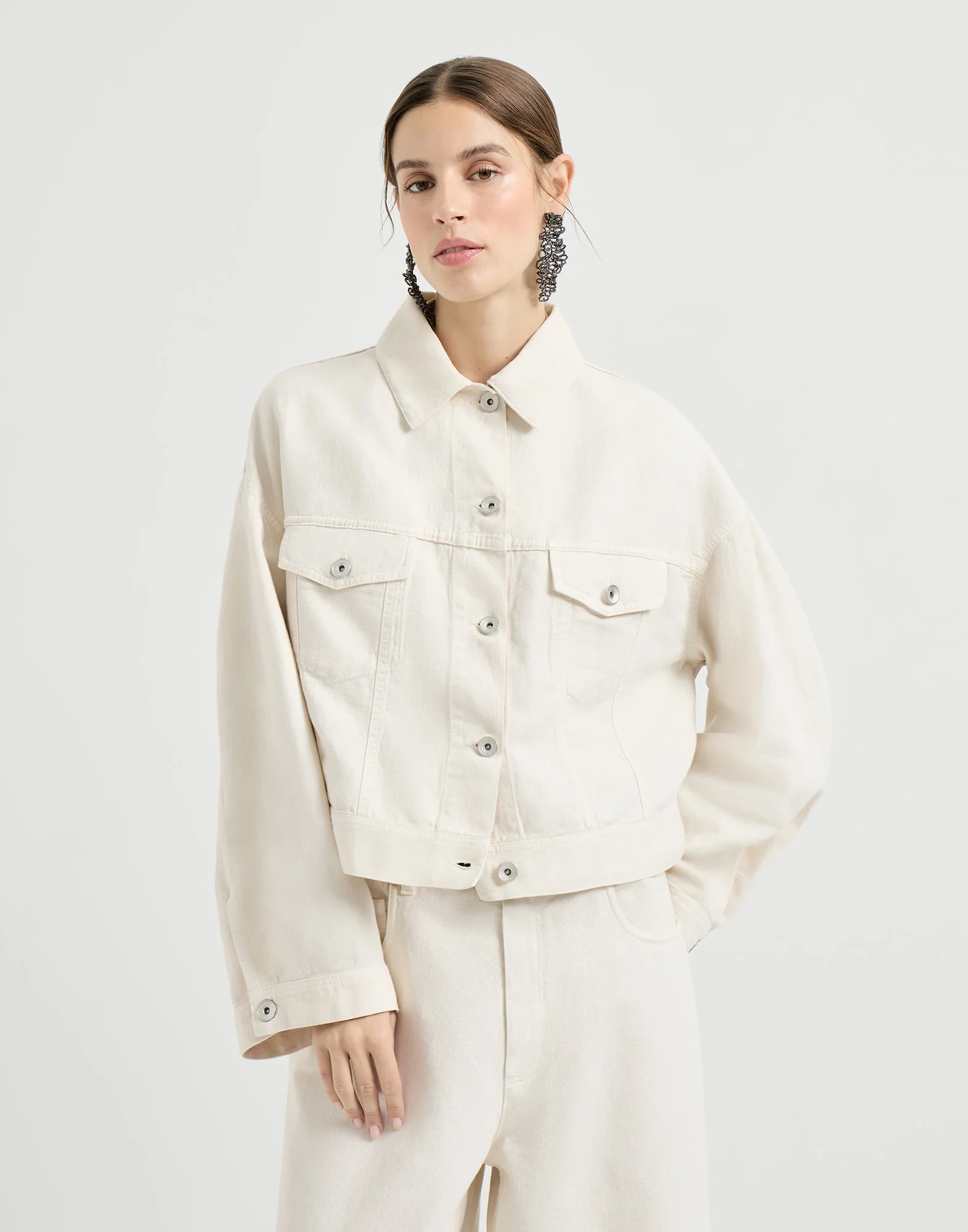 The refined materials of the Brunello Cucinelli collections update the sporty lines of this outerwear jacket. The distinctive diagonal texture of cotton and linen cover, dyed in the season’s delicate colors, is paired with the casual details of the flap pockets and the metal button closure. The precious monili behind the neck adds an elegant, shimmering feminine note. MATERIALS Cover is a fabric characterized by a slightly three-dimensional diagonal texture. The blend of cotton and linen lessens the twill pattern, giving the garment a soft, casual look. DETAILS Metal button closure Shirt-style collar Button cuffs Upper pockets with flap and button Side buttons for fit adjustment Unlined Nickel-free monili decoration 60% COTTON, 40% LINEN