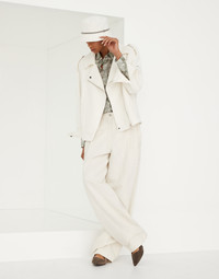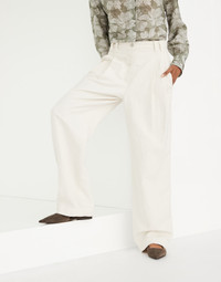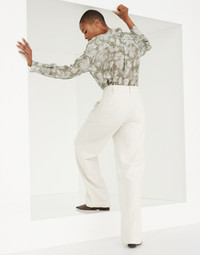 Comfortable proportions and feminine details define the style of these new Relaxed trousers. The soft, slightly crisp texture of cotton and linen cover enhances the garment’s casual lines, characterized by a straight cut that widens at the bottom. MATERIALS Cover is a fabric characterized by a slightly pronounced texture. The combination of cotton and linen slightly softens the diagonal pattern, giving this shirt a soft, sporty appearance. Delicate color fading enriches the fabric with a summery touch. DETAILS Zip closure with button Front pockets Back patch pockets Double pleat 60% COTTON, 40% LINEN