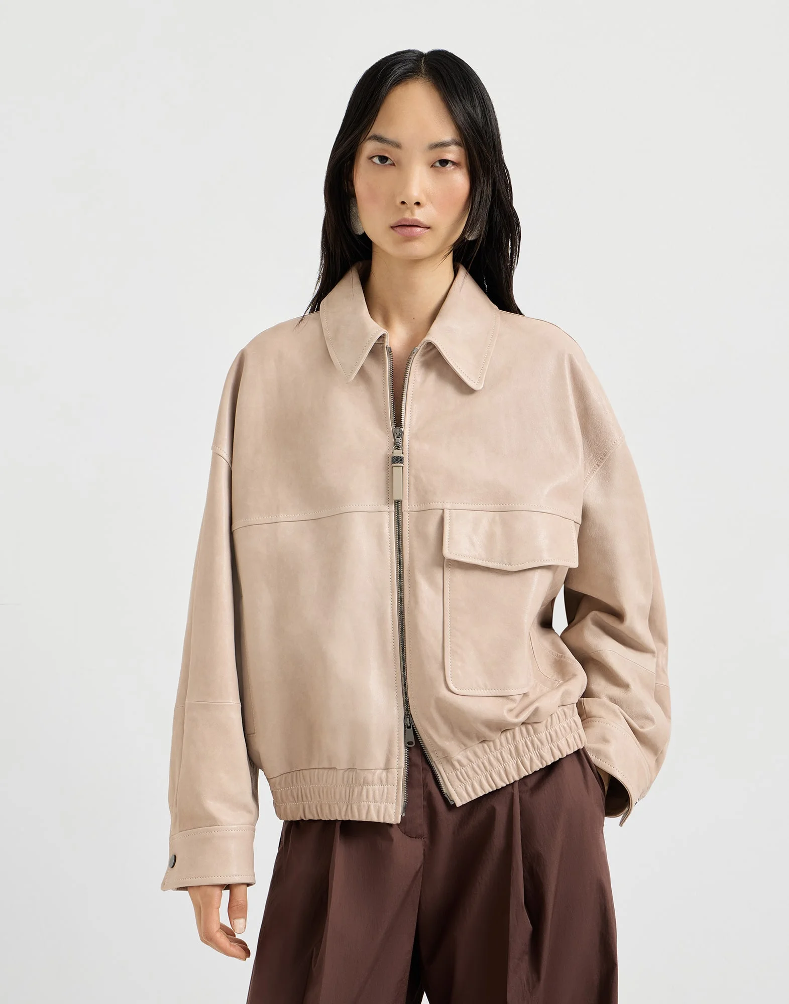 Refined Brunello Cucinelli materials elevate the sporty style of this glossy nappa leather outerwear jacket. The elegant polished leather is dyed in the season’s colors and makes the garment perfect to wear in the milder months. A precious shiny monili detail adds a delicate sparkle. MATERIALS Refined glossy nappa is characterized by a soft effect that is very nice to the touch. The dye and finish give the texture a polished look that enhances the leather’s fine natural grain. DETAILS Two-way zip closure Shirt-style collar Snap cuffs Vertical hand pockets Lower pocket with button Silk-blend crepe lining Elasticized hem Nickel-free monili decoration 100% REAL LEATHER