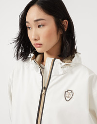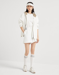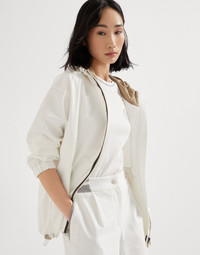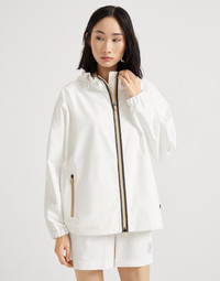 Refined Brunello Cucinelli details elevate the casual feel of this nylon outerwear jacket. The garment features straight, slightly loose lines, highlighted by the drawstring bottom band that creates a slight balloon effect. The drawstring hood and low zipper pockets are convenient, practical details. A precious monili embroidery traces a bright trail along the zipper closure, adding a radiant, refined and feminine sparkling note. The iconic Solomeo heraldic coat of arms on the chest complements the look of the garment. MATERIALS Nylon is an ultra lightweight and thin material with a smooth hand. A finish helps to protect the fabric from the slightest contact with water. DETAILS Two-way zip closure Unlined Adjustable drawstring hood Hand pockets with zipper Drawstring hem Nickel-free monili decoration 93% POLYESTER, 7% POLYURETHANE