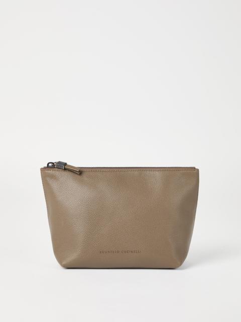 Grained leather pouch with shiny zipper pull