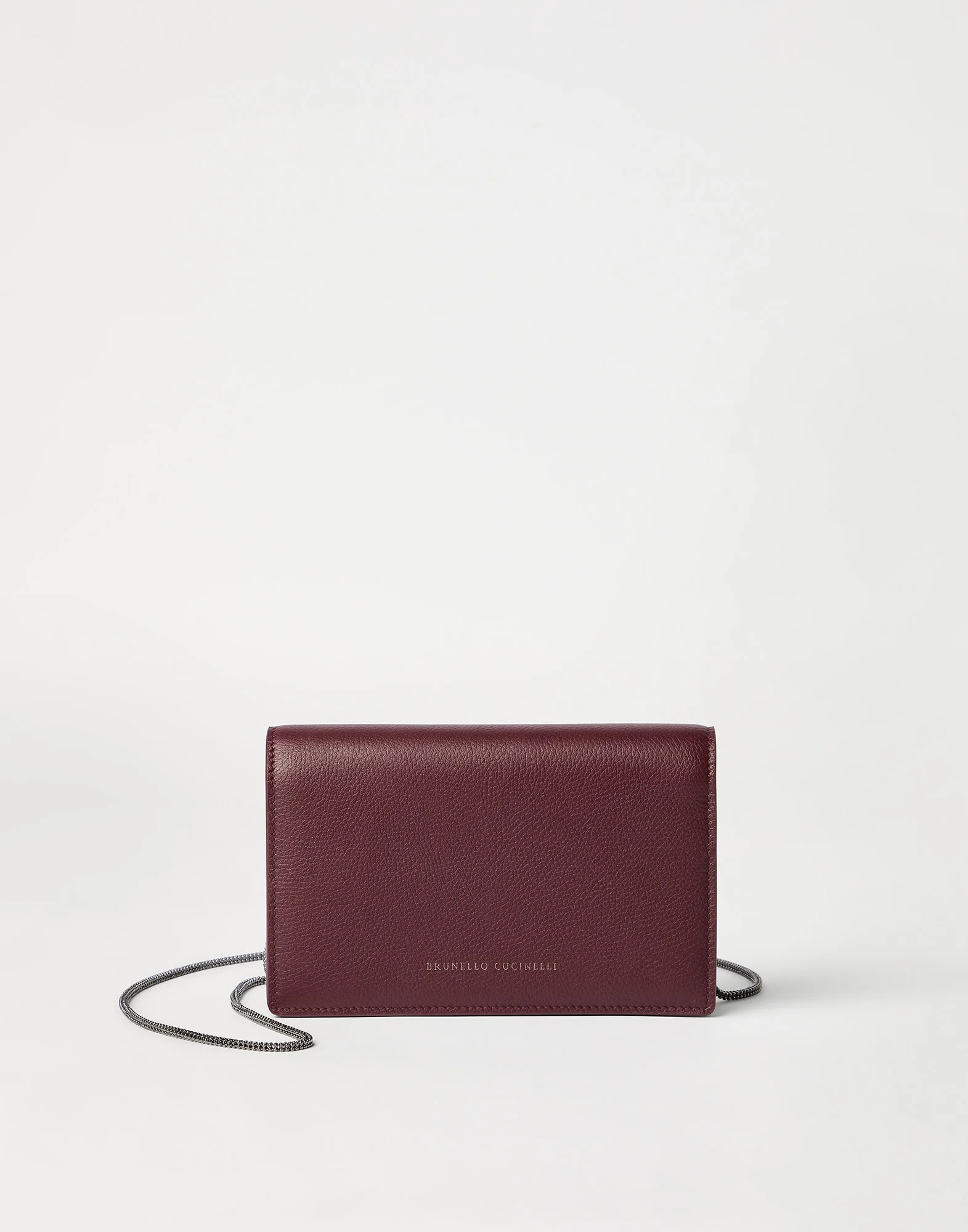 Refined materials and iconic details define the look of this grained leather wallet. The special leather highlights the slight irregularities that give a delicate three-dimensional effect to the accessory. Equipped with several compartments for cards and bills, as well as a zipper coin purse, the wallet is completed by a removable precious monili shoulder strap, enriching the design with a sparkling touch in true Brunello Cucinelli style. MATERIALS Manufacturing of the leather gives the texture a rich and even grain with a smooth and semi-polished appearance. DETAILS Magnetic snap closure Detachable shoulder strap Leather lining Coin purse with zip closure 6 slots for cards and business cards Nickel-free monili decoration Accessory is approx. 19 cm long, 12 cm high and 4,5 cm wide REAL LEATHER