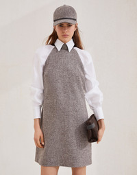 British inspiration and precious details come together in this new virgin wool tweed dress that reinterprets tradition with a contemporary feel. Defined by its clean lines, the trapezoid silhouette is enhanced by an American neckline that reveals the shoulders, highlighting a distinctly feminine elegance. The shimmering embellished collar, made of precious tubular beads with a metallic finish, complete the garment with a very refined, sophisticated touch. MATERIALS The virgin wool tweed is a warm, resistant fabric, characterized by a slightly irregular surface and a substantial hand. Traditionally associated with the style of British menswear, it stands out for its textured appearance and the typical slightly melange chevron design. DETAILS Back zip closure Decorated collar Off-the-shoulder style Silk-blend crepe lining 73% VIRGIN WOOL, 27% NYLON