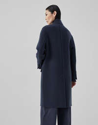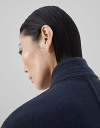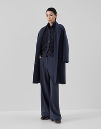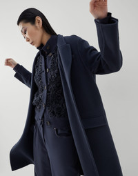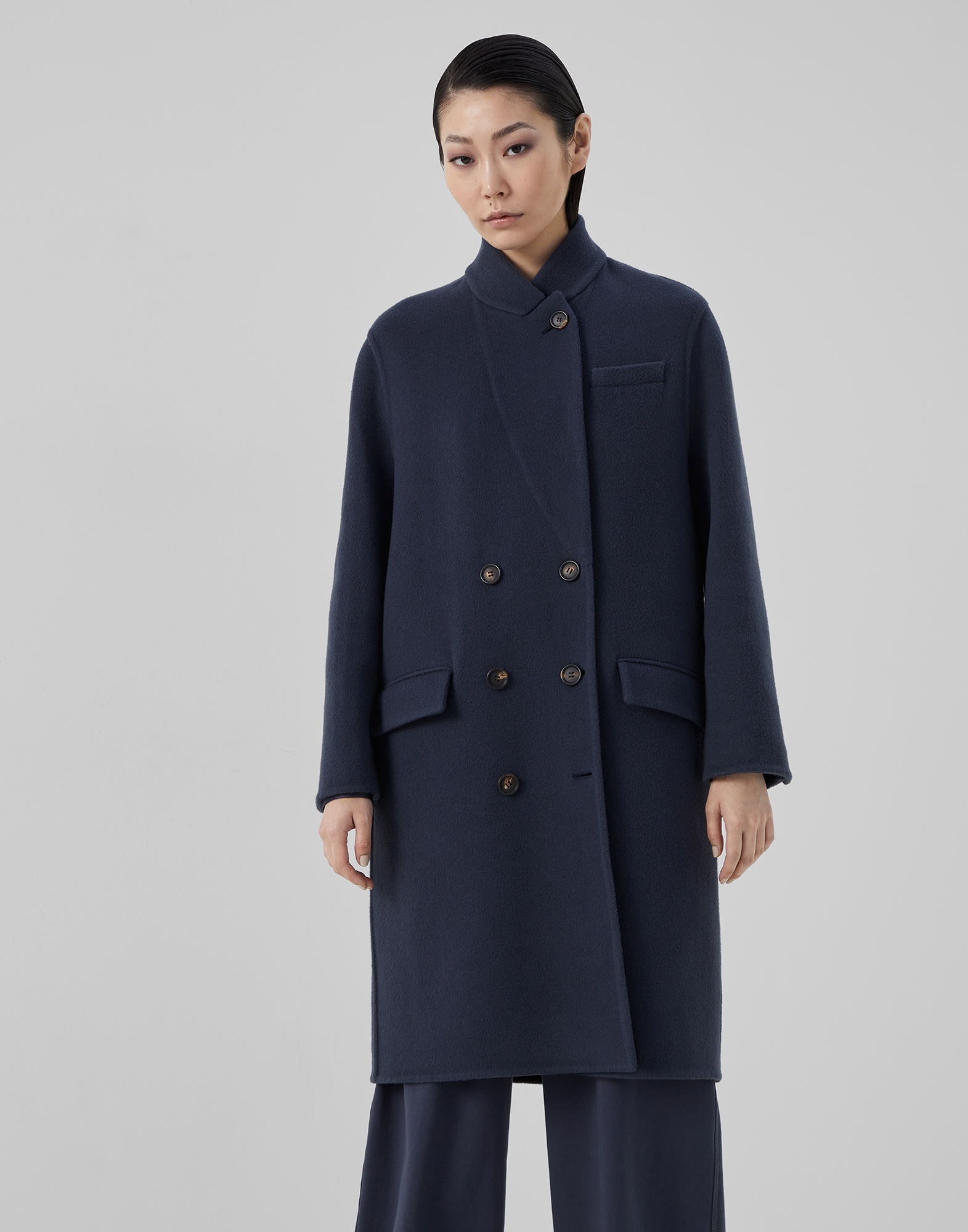 Premium materials and a classic feel characterize this virgin wool and cashmere double cloth coat. A special handcrafted technique accentuates the yarn’s softness and warmth, while the menswear-inspired flap pockets and double-breasted silhouette give the coat a timeless allure. A fine shiny monili embroidery illuminates the back collar, complementing the item with a precious note, in true Brunello Cucinelli style. MATERIALS Special manufacturing creates the virgin wool and cashmere hand-finished fabric: two fabrics are simultaneously created on a loom using a construction with ultra fine threads that unites them along the entire surface. The material is thin, lightweight, and, at the same time, soft and cozy. DETAILS Horn button closure Lapel collar Cuffs have three horn buttons Hand pockets with flap Single back vent Nickel-free monili decoration 90% VIRGIN WOOL, 10% CASHMERE