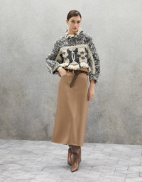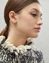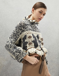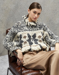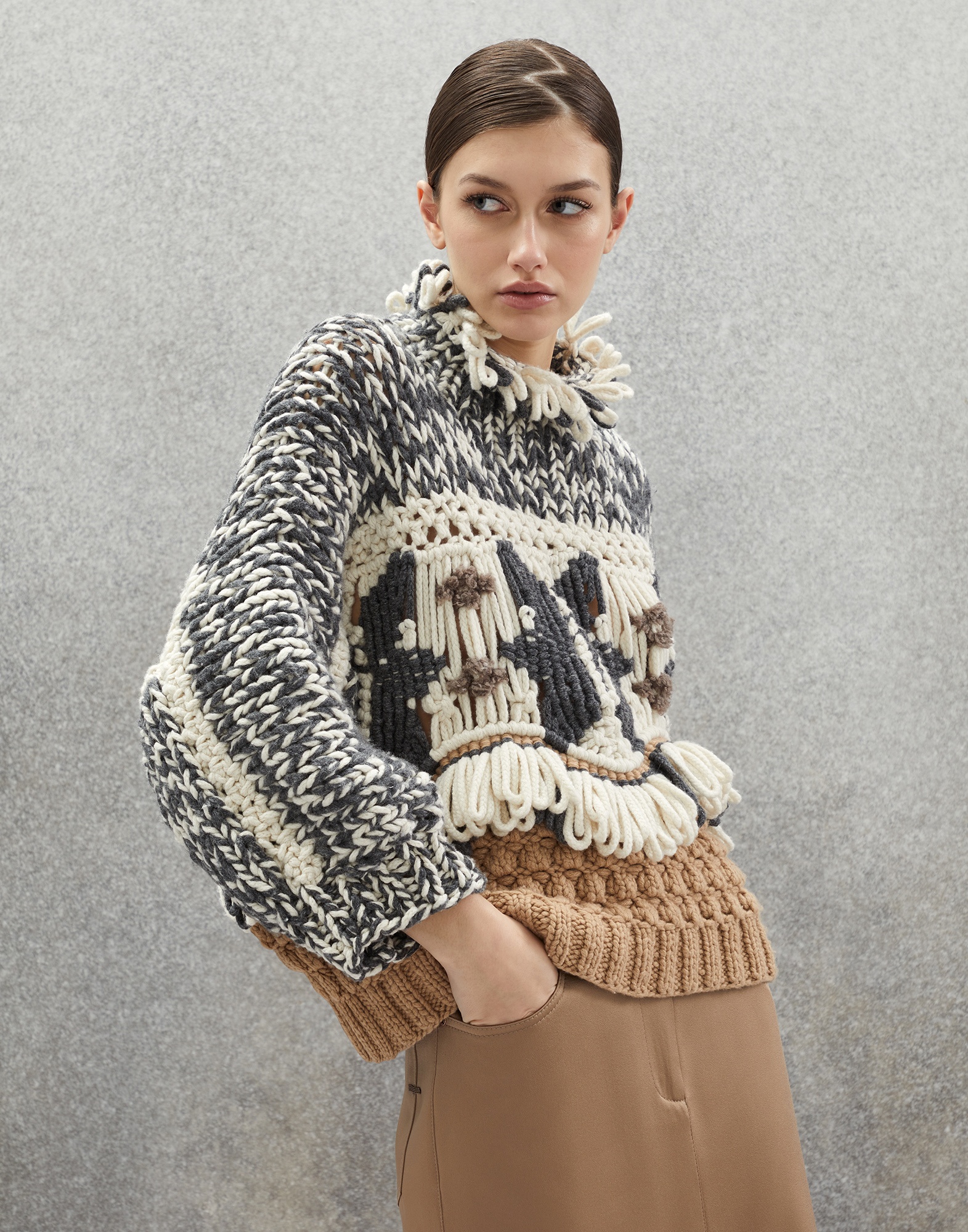 Ancient craftsmanship is reinterpreted in a sophisticated, modern way in this handmade cashmere OPERA Macramé Intarsia sweater. Different manual techniques are showcased in the garment: crocheting is predominantly used for the bottom, while knitting is used for the shoulders and sleeves. A third phase involves macramé, used to create the floral pattern inspired by Nordic tradition. All of the steps require a very high level of expertise from artisans, who finalize their work with the application of embroidered details to make each creation unique. MATERIALS To make each part of the garment, cashmere Feather yarn and cashmere Fleecy yarn are crafted by hand. The combination of these refined yarns provides the garment with an extremely soft hand and creates a full effect that remains incredibly lightweight. DETAILS High collar Wide sleeve Various knit stitches Handmade 100% CASHMERE