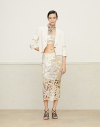 Traditional floral motifs meet refined crochet designs in this special Marine Flower Crochet OPERA skirt. The entirely handmade crochet technique creates interplays of full and empty spaces inspired by classic lace, reproducing the shape of an imaginary marine flower with an ethereal and precious effect. It takes approximately 33 hours of work to make a single garment: every component is hand crocheted; afterwards, all of the pieces are hand assembled by artisans whose expertise makes it possible to give each creation unique, one-of-a-kind characteristics. MATERIALS To make every single component of the garment, a number of different iconic yarns are hand crocheted together: linen threads with Dazzling cotton threads, Soft Piuma cotton threads, slubbed silk and linen threads, malfilé cotton threads and techno rafia threads. DETAILS Elastic waistband Silk-blend crêpe lining Handmade 43% LINEN, 29% COTTON, 28% POLYESTER