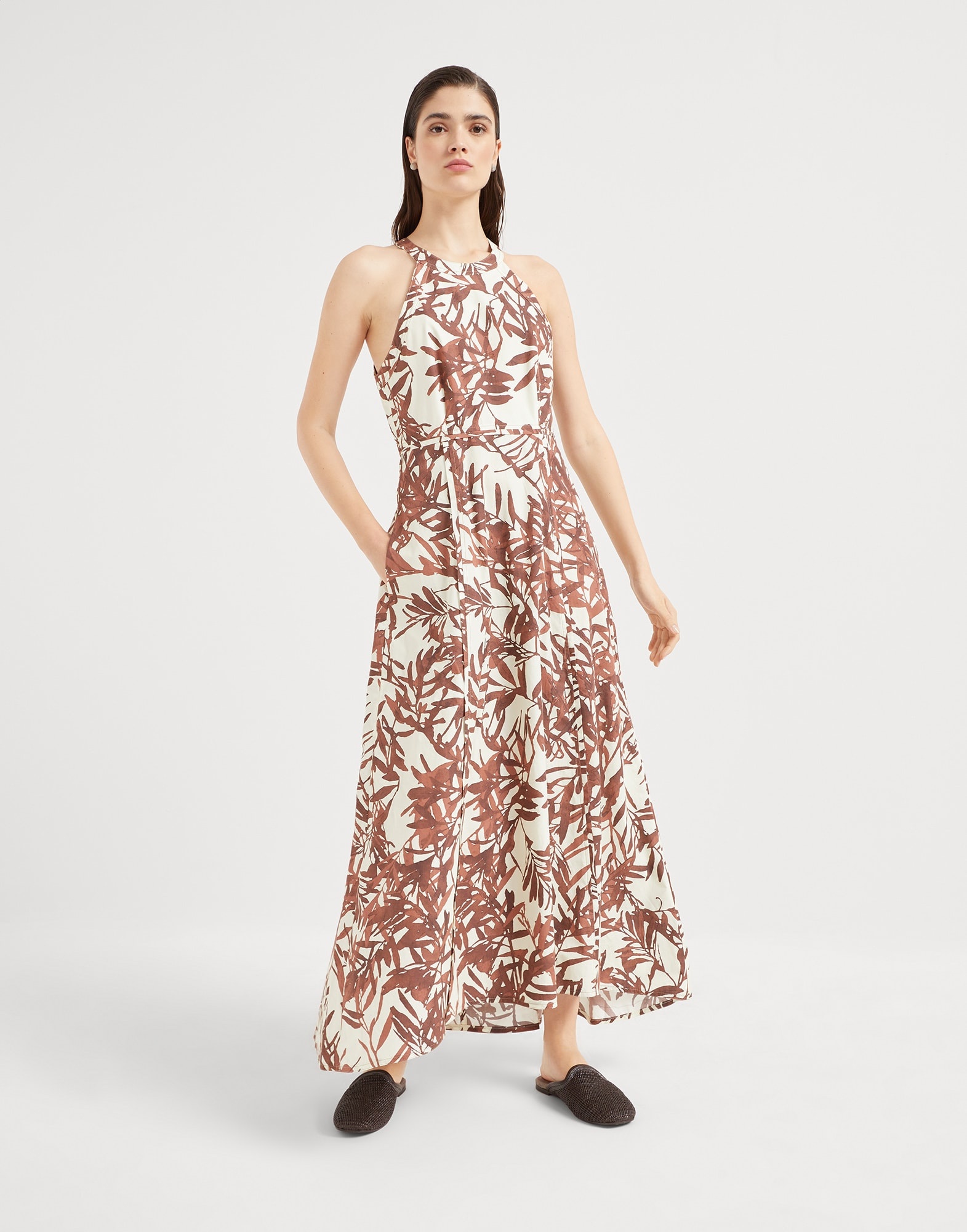 Contemporary shapes and seasonal patterns interpret the summery feel of this new cotton poplin dress. Inspired by nature’s beautiful shapes, the Herbarium print gives the garment’s fluid lines a sense of movement, while the Halterneck neckline adds a particularly elegant touch to the dress. The precious monili detail provides a feminine sparkle in true Brunello Cucinelli style. MATERIALS A classic fabric from the Brunello Cucinelli collections, the cotton poplin is enriched with a new nature-themed print. The Herbarium design features elegant stylized leaves that extend gently throughout the entire surface. The pattern evokes the freshness of nature with timeless elegance, giving the fabric a sophisticated allure. DETAILS Back zip closure Hand pockets Half-lined Nickel-free monili decoration 100% COTTON