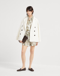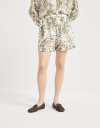 A mix of refined materials and a casual silhouette defines the style of these silk pongee Track shorts. The garment showcases the airy fabric’s smooth, fluid texture, which pairs perfectly with the seasonal Herbarium Print, inspired by the beauty of natural forms and presented in the season’s colors. The pull-on fit defines the comfort of the shorts. MATERIALS Pure silk pongee is a refined fabric characterized by a fluid texture and a semi-glossy appearance. Printed in the season’s colors, the Herbarium design is inspired by the shapes of nature, with sophisticated stylized leaves that extend gently throughout the entire surface. The pattern evokes the freshness of nature with timeless elegance, giving the fabric a polished allure. DETAILS Pull-up trousers Front pockets 100% SILK