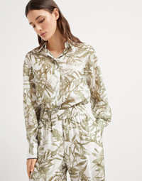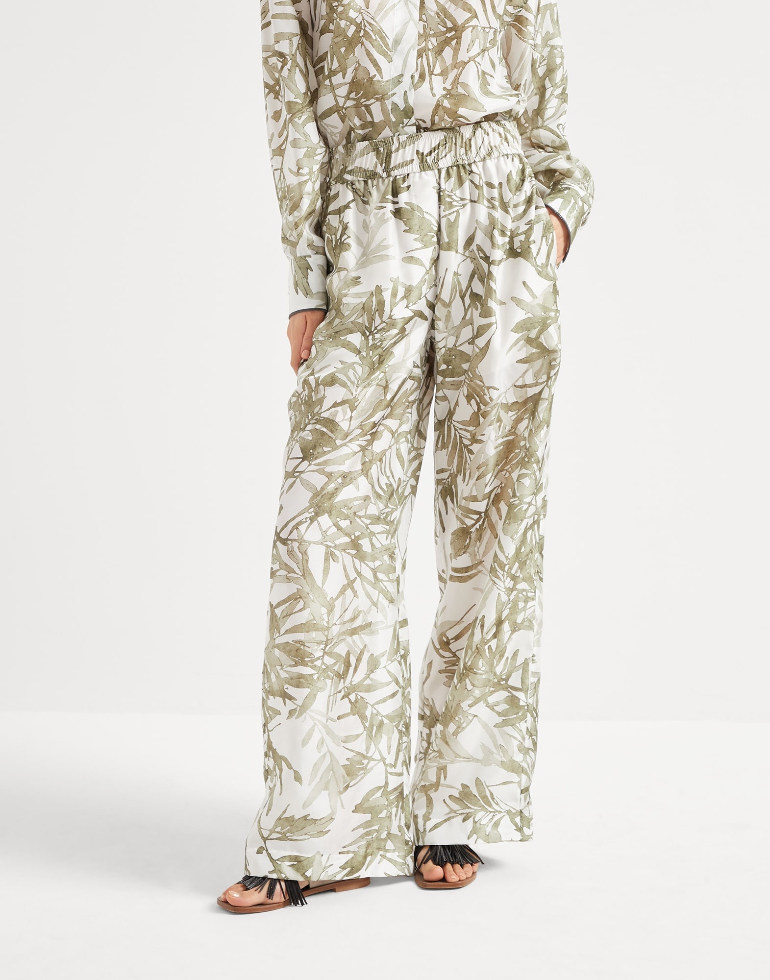 The relaxed volume of these Pyjama trousers is enriched with the refined texture of pure silk pongee. The garment’s smooth, fluid texture enhances the casual style of the Loose silhouette, characterized by a pull-on design with soft, wide proportions. The Herbarium Print, inspired by the beauty of natural forms, complements the garment's summery allure. MATERIALS Pure silk pongee is a refined fabric characterized by a fluid texture and a semi-glossy appearance. Printed in the season’s colors, the Herbarium design is inspired by the shapes of nature, with sophisticated stylized leaves that extend gently throughout the entire surface. The pattern evokes the freshness of nature with timeless elegance, giving the fabric a polished allure. DETAILS Pull-up trousers Elastic waistband Front pockets Back pockets Unlined 100% SILK