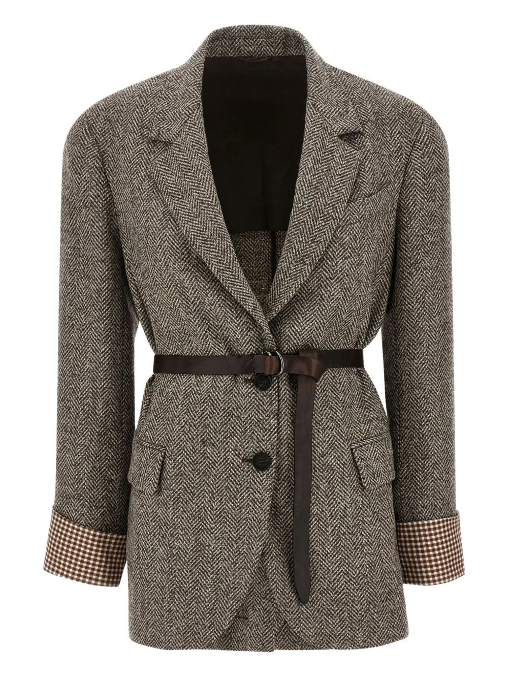 herringbone belted blazer Highlights - Brown - Herringbone pattern - Notched lapels - Belted waist - Single button fastening Made in Italy Composition Virgin Wool 73%, Polyamide 27% Washing instructions Read Manufacturer Guidelines