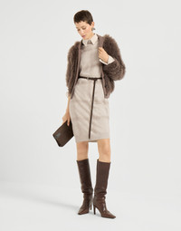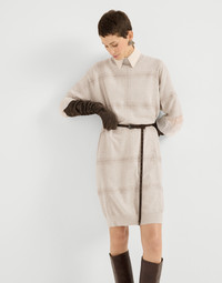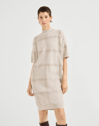 Refined Brunello Cucinelli yarns and classic patterns elevate the distinctly casual attitude of this new virgin wool, cashmere and silk knit dress. The design conveys the timeless sophistication of the macro Prince of Wales pattern, reinterpreted in a feminine way through an embroidery of luminous sequins that spread shimmering reflections with every movement. The relaxed, slightly oversized silhouette features dropped shoulders and short sleeves that emphasize the garment’s informal appearance. MATERIALS Thanks to refined workmanship, the virgin wool, cashmere and silk yarn offers lightness and comfort when worn, providing the right amount of protection that is essential between seasons. DETAILS High collar Wide sleeve Plain stitch 60% VIRGIN WOOL, 30% CASHMERE, 10% SILK
