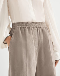 A relaxed feel and informal fabrics define the style of these loose track trousers in comfort cotton narrow wale corduroy. The garment features a comfortable silhouette emphasized by the pull-on fit, with soft, straight proportions down the leg. The narrow wale corduroy gives the trousers a retro look and adds a sophisticated touch of texture. MATERIALS The comfort cotton narrow wale corduroy is characterized by a soft, velvety texture. A small percentage of synthetic fiber provides added comfort. DETAILS Pull-up trousers Front pockets Back patch pockets Lined 99% COTTON, 1% ELASTANE